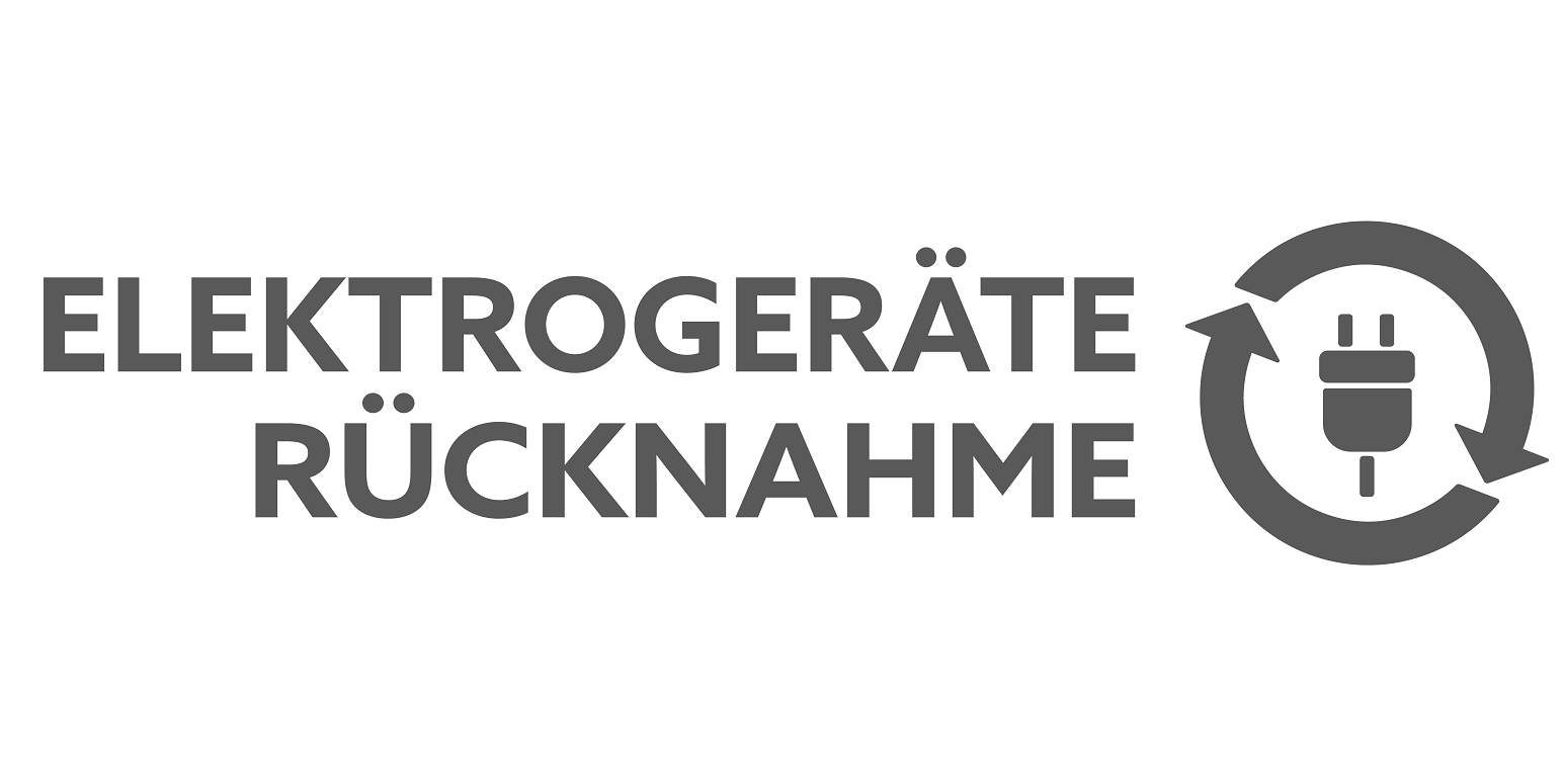 Logo aus dem Schriftzug "Elektrogeräterücknahme" und einem Piktogramm, das einen Stecker inmitten von zwei im Kreis laufenden Pfeilen zeigt Einheitliches Logo für Sammel- und Rücknahmestellen für Elektrogeräte im Handel und in den Kommunen