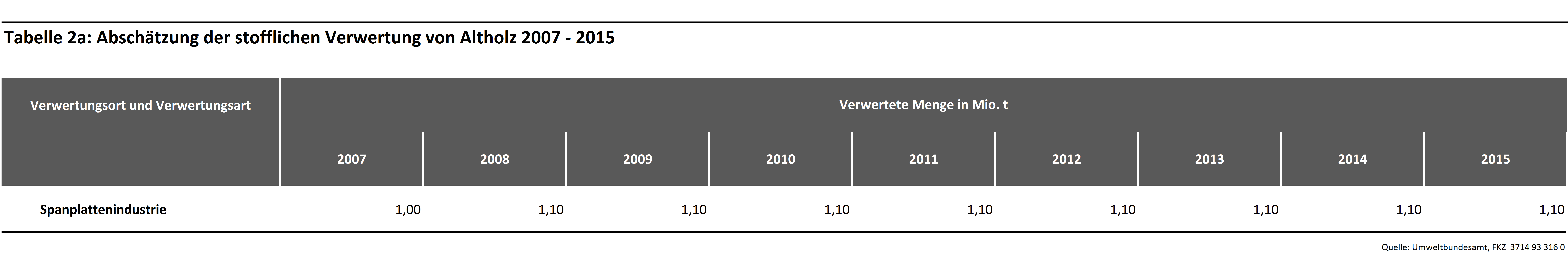 Tabelle 2a: Abschätzung der stofflichen Verwertung von Altholz 2007 - 2015 Quelle: Umweltbundesamtaltholz_tabellen.xlsx