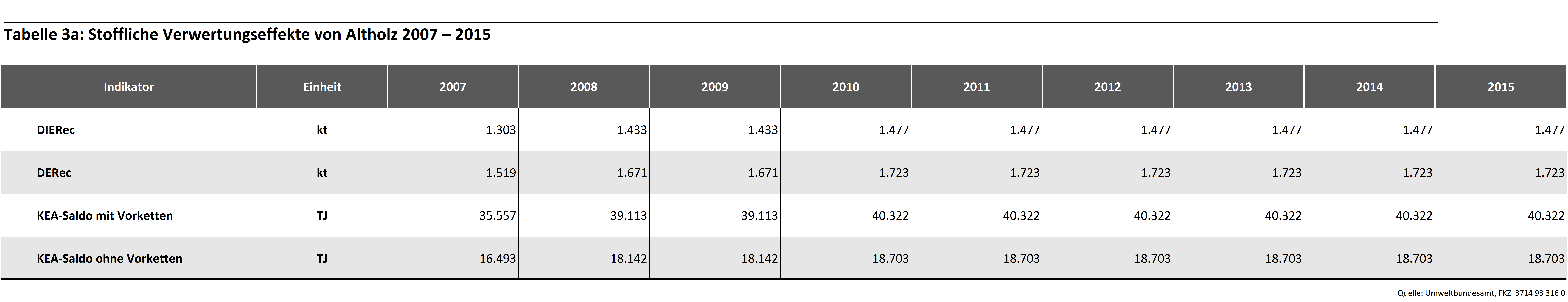 Die folgenden Tabellen geben die Verwertungswege für Altholz in Deutschland, die zur Bilanzierung berücksichtigten Substitutionsäquivalente sowie eine Zeitreihe der angenommenen Verwertungsmengen wieder. Es wird dabei eine Differenzierung nach stofflicher und energetischer Verwertung vorgenommen.