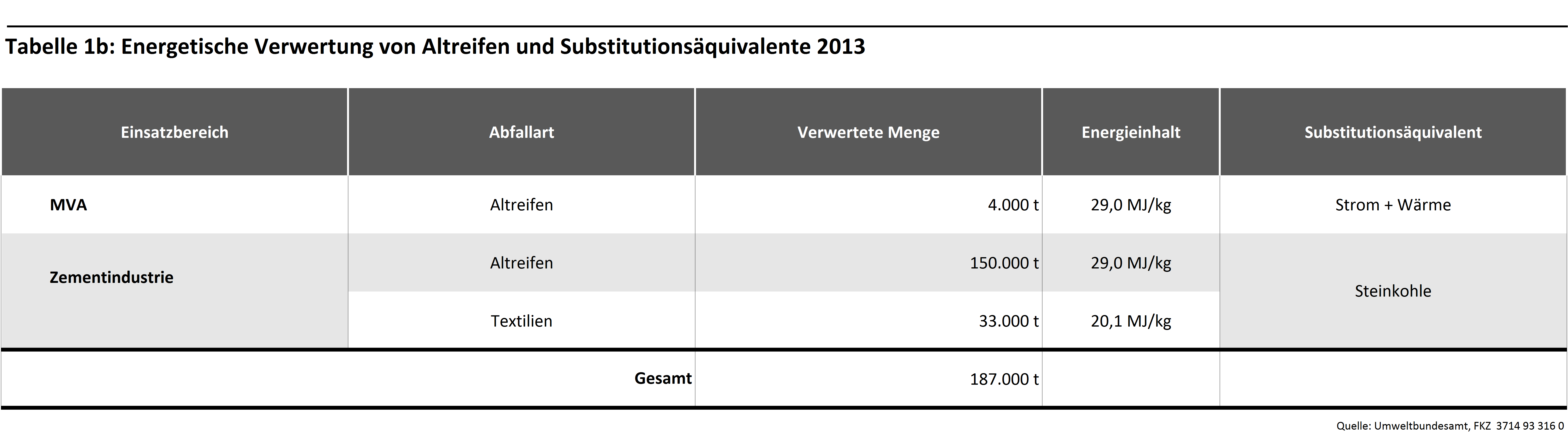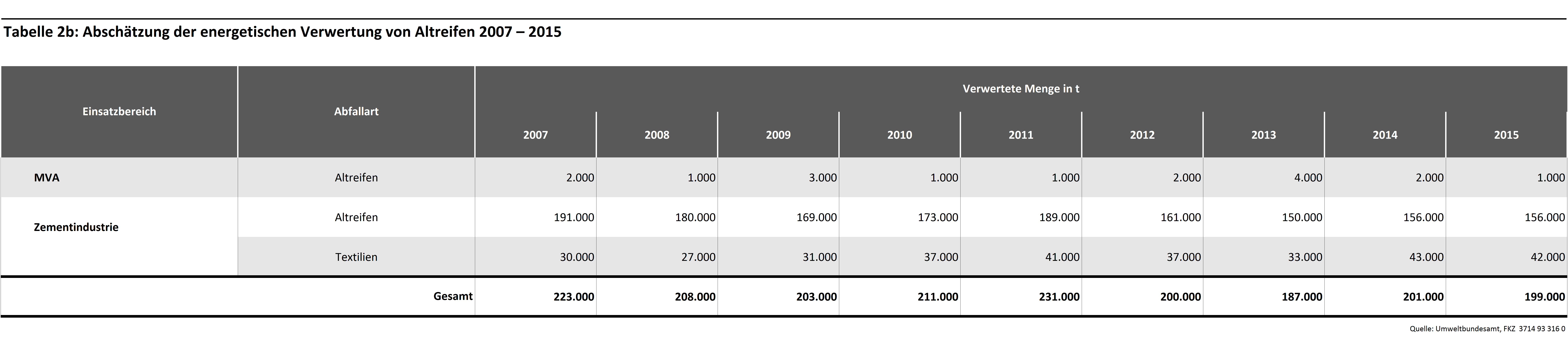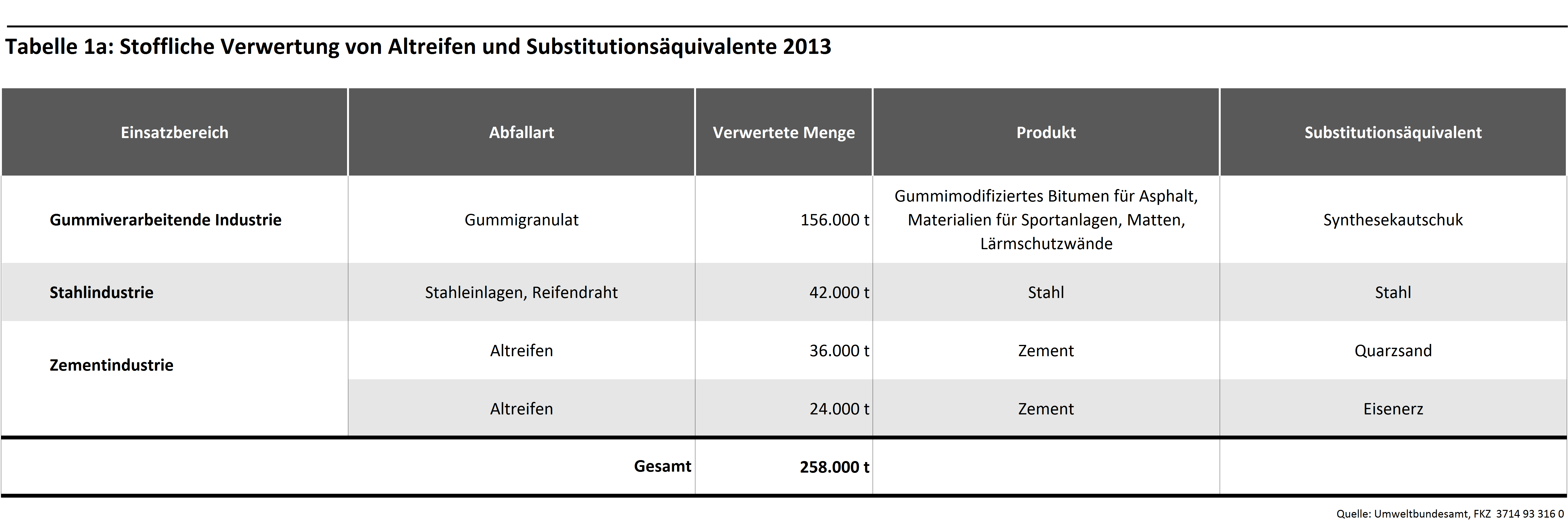 In der gummiverarbeitenden Industrie sowie Zementindustrie werden die Materialien von Altreifen energetisch und rohstofflich verwertet. So geht mit der Verbrennung von Altreifen in der Zementindustrie mit der Nutzung des Energieinhalts auch ein stofflicher Nutzen einher. Aufgrund der hohen Prozesstemperaturen bei der Klinkerherstellung verbrennen die Reifen fast vollständig. Neben Natur- und Synthesekautschuk oxidieren auch Ruß und die enthaltenen Stahleinlagen. Die verbleibenden Verbrennungsrückstände gehen als Zusatzstoffe in den Klinker über und werden anstelle von Primärrohstoffen Bestandteil des Zements.