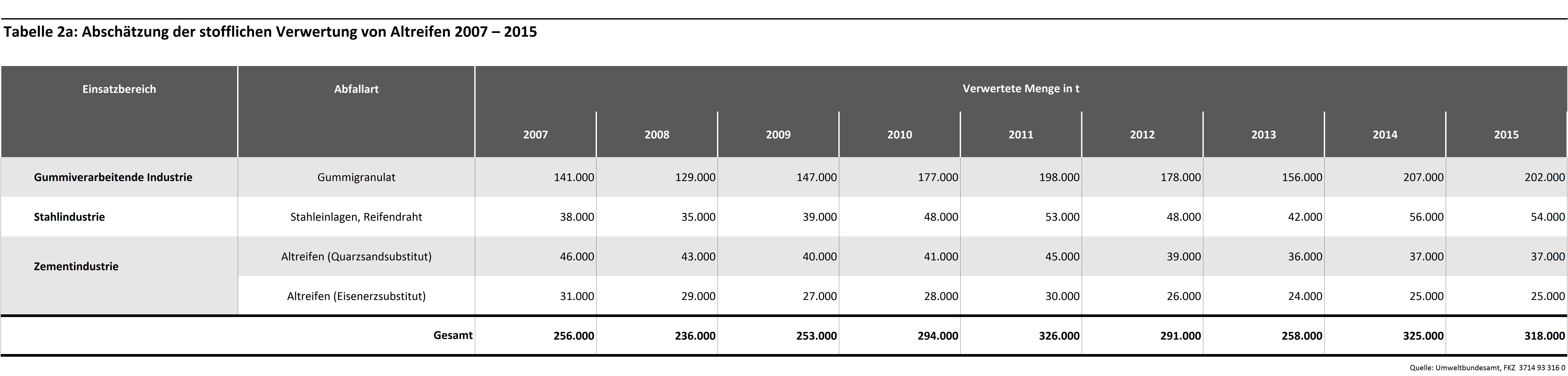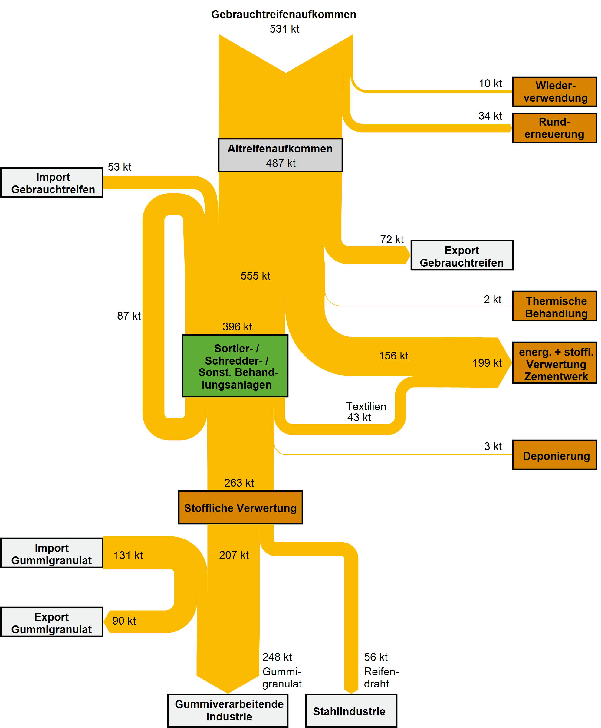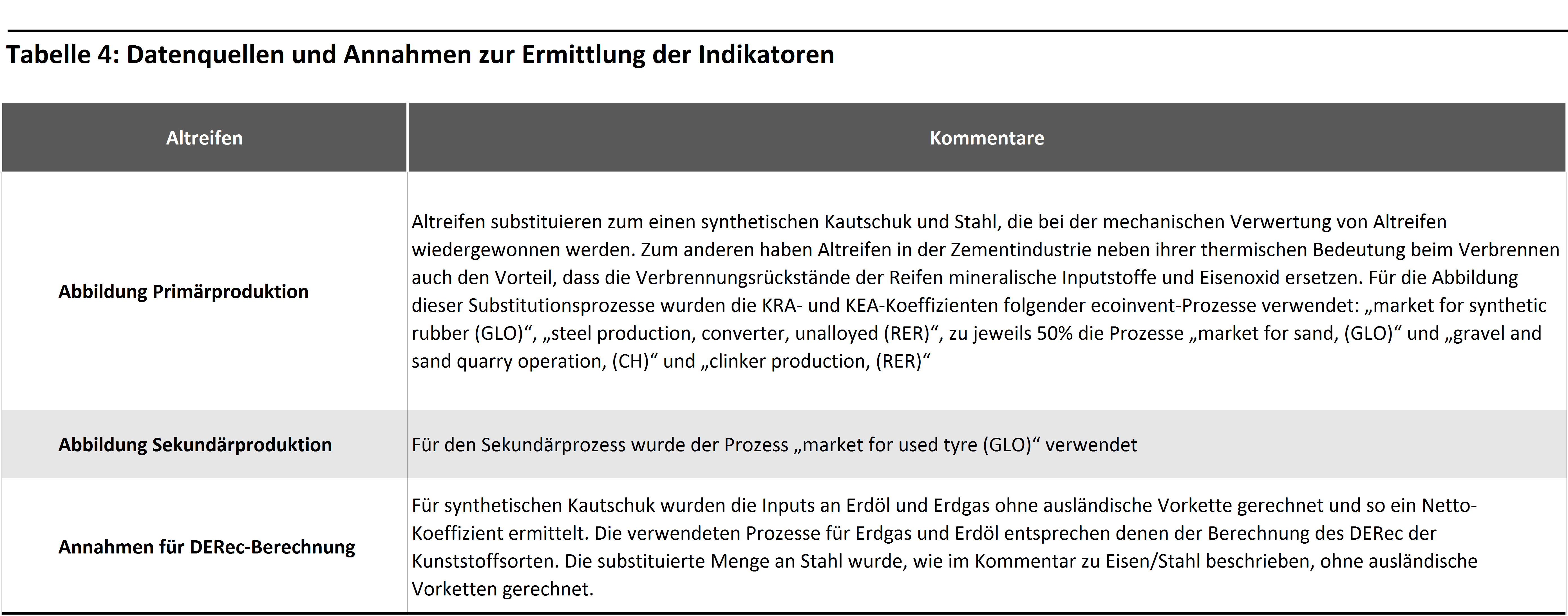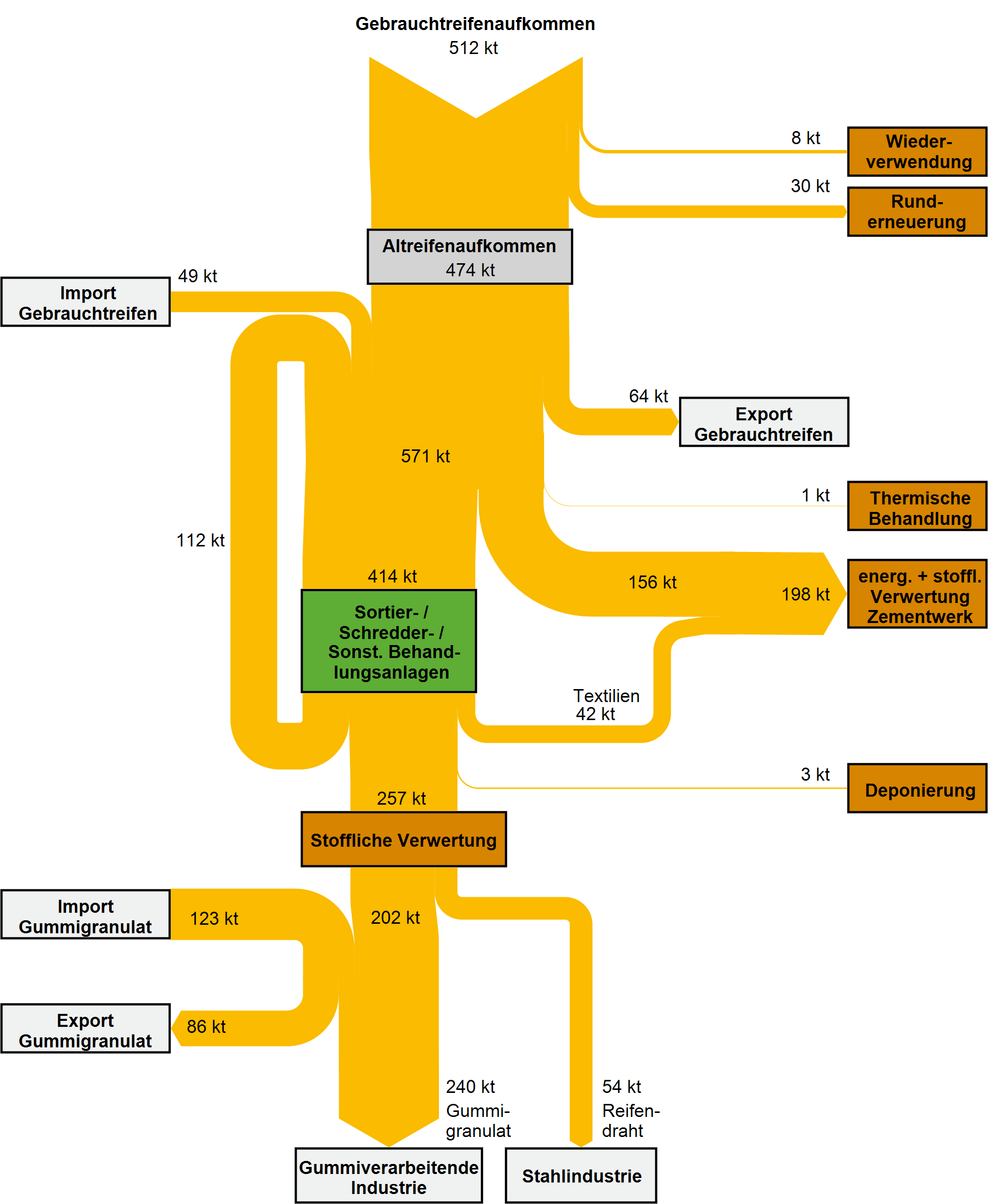 In der gummiverarbeitenden Industrie sowie Zementindustrie werden die Materialien von Altreifen energetisch und rohstofflich verwertet. So geht mit der Verbrennung von Altreifen in der Zementindustrie mit der Nutzung des Energieinhalts auch ein stofflicher Nutzen einher. Aufgrund der hohen Prozesstemperaturen bei der Klinkerherstellung verbrennen die Reifen fast vollständig. Neben Natur- und Synthesekautschuk oxidieren auch Ruß und die enthaltenen Stahleinlagen. Die verbleibenden Verbrennungsrückstände gehen als Zusatzstoffe in den Klinker über und werden anstelle von Primärrohstoffen Bestandteil des Zements.