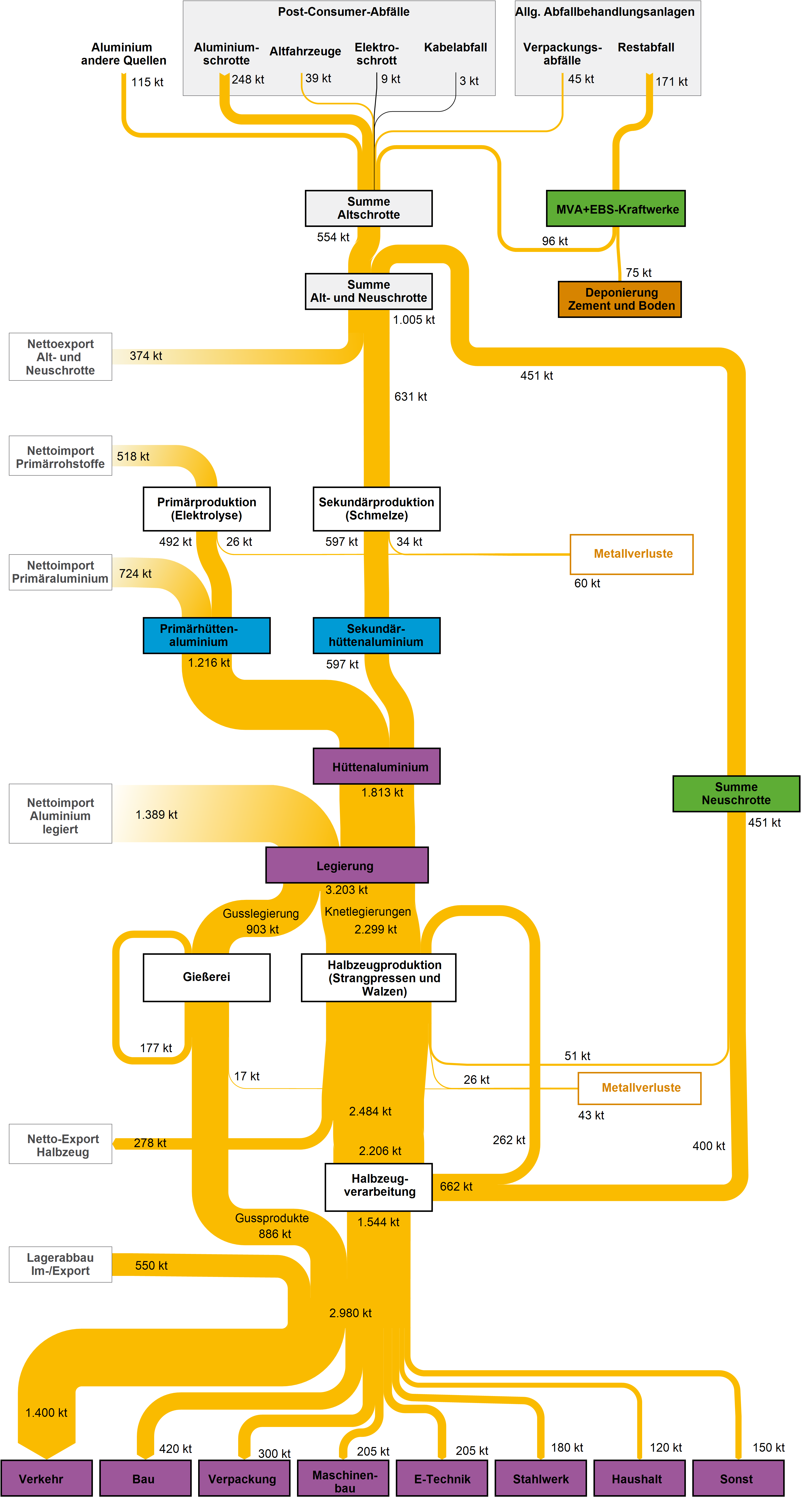 Das nachfolgende Sankey-Diagramm gibt einen Überblick über die im Projekt ReSek abgeschätzten Aluminiumstoffströme in Deutschland für das Jahr 2013. Hinterlegt sind in der Galeriebox ebenfalls die Sankey-Darstellungen für 2007 und eine Fortschreibung der Entwicklung für 2015. Eine weiterführende Erklärung zu den Stoffströmen und Modellannahmen ist dem Projektbericht ReSek (FKZ 3714 93 330 0) zu entnehmen.