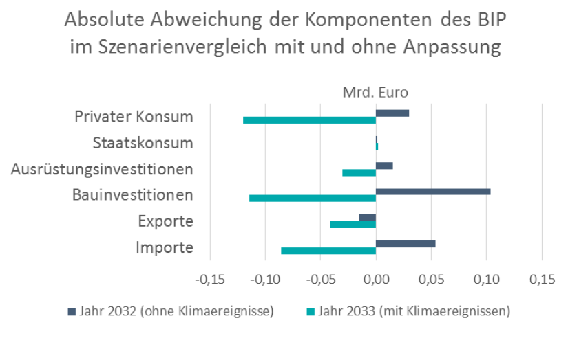 Für die Modellrechnung wird angenommen, dass die Anpassungsmaßnahme zu einer Ertüchtigung der Infrastruktur führt, welche durch die öffentliche Hand finanziert wird. Es werden jährlich zusätzlich 100 Mio. Euro investiert. Daraus resultiert eine höhere Auftragslage in der Bauwirtschaft und den damit verbundenen Sektoren. Dementsprechend liegen die Produktionswerte der betroffenen Sektoren höher. In der Summe haben die zusätzlichen Bauinvestitionen folglich eine positive Wirkung auf das Bruttoinlandsprodukt (BIP).