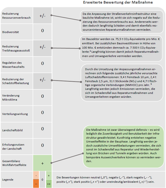 ( +/- ) Reduzierung des Ressourcenverbrauchs Da die Anpassung der Straßenverkehrsinfrastruktur eine bauliche Maßnahme ist, wirkt sie sich negativ auf die Reduzierung des Ressourcenverbrauchs aus. Andererseits werden dadurch langfristig Schäden und damit ebenfalls ressourcenintensive Reparaturmaßnahmen vermieden.