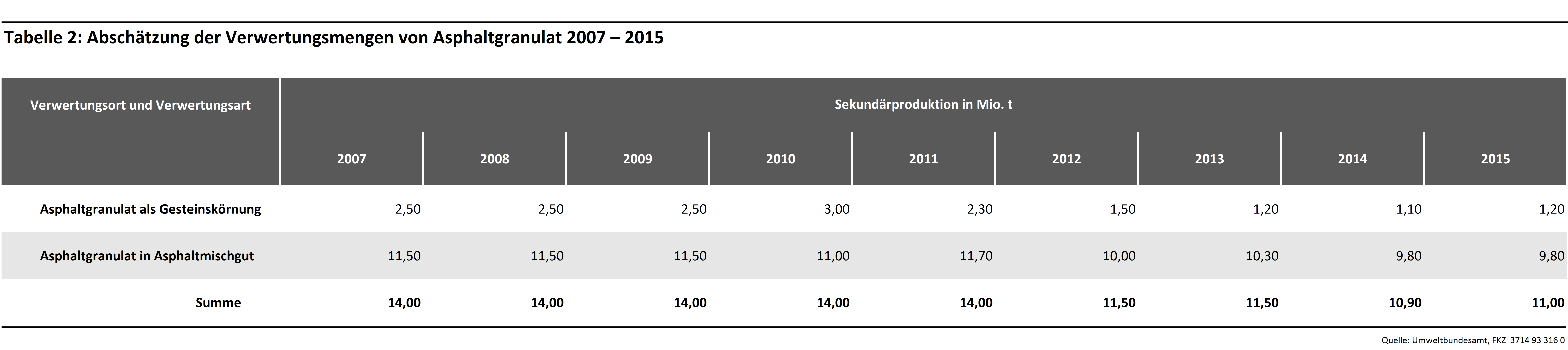 Bei einem Teil des anfallenden Asphaltgranulats erfolgt jedoch ein Downcycling im Straßenunterbau und ähnlichen Anwendungen. Hierbei wird es bei der Herstellung von Schichten ohne Bindemittel, Tragschichten mit hydraulischen Bindemitteln oder bitumengebundenen Tragschichten in Kaltaufbereitung verwendet.