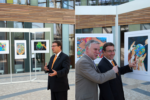 Bild links: Hoher Besuch. Achim Steiner besucht die Kinderbilder-Ausstellung im Foyer des UBA.