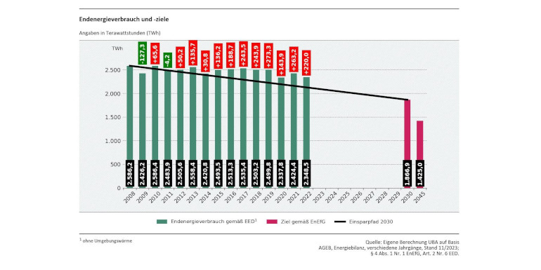 Abb. 1: Endenergieverbrauch und -Ziel gemäß Energieeffizienzgesetz für 2030 und 2045