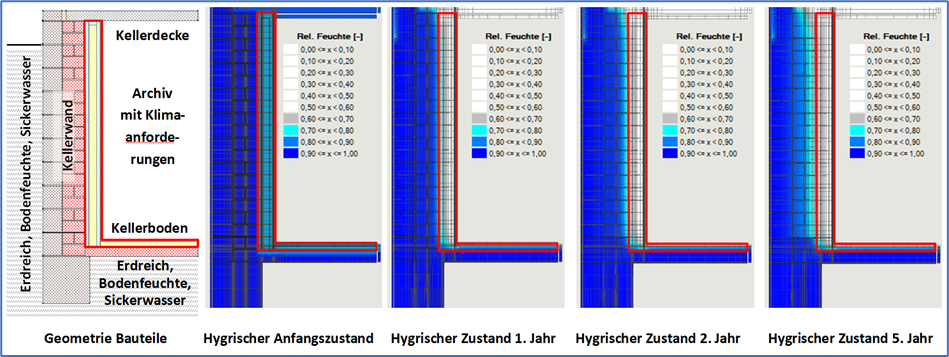 Abbildung 6: Modellgeometrie und Trocknungsfortschritt in der Simulation zum Pilotprojekt