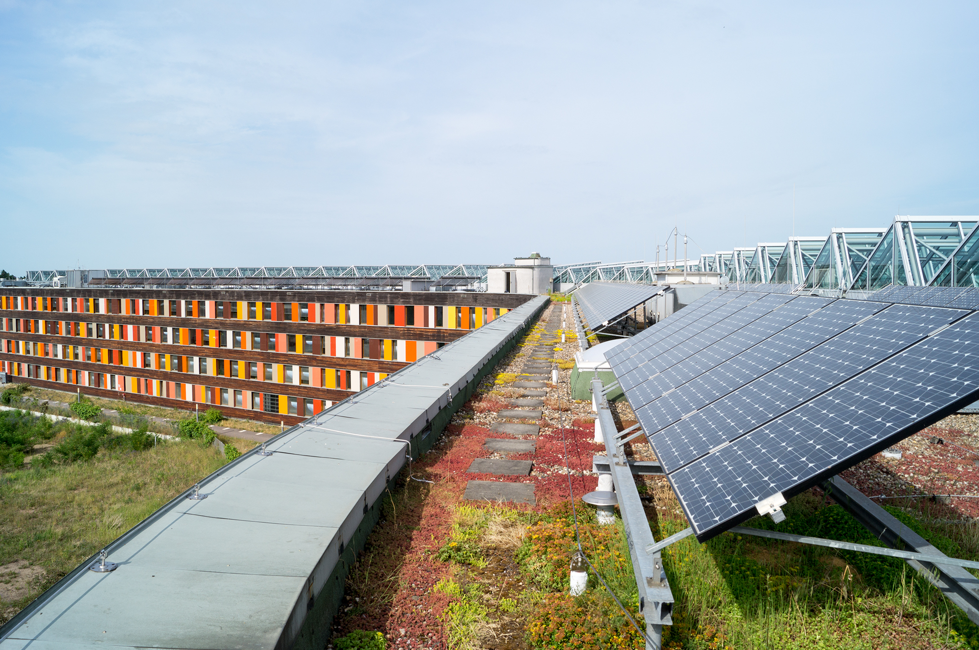 Auf dem UBA-Gebäude in Dessau sorgt eine Photovoltaikanlage für Strom aus erneuerbaren Energien.