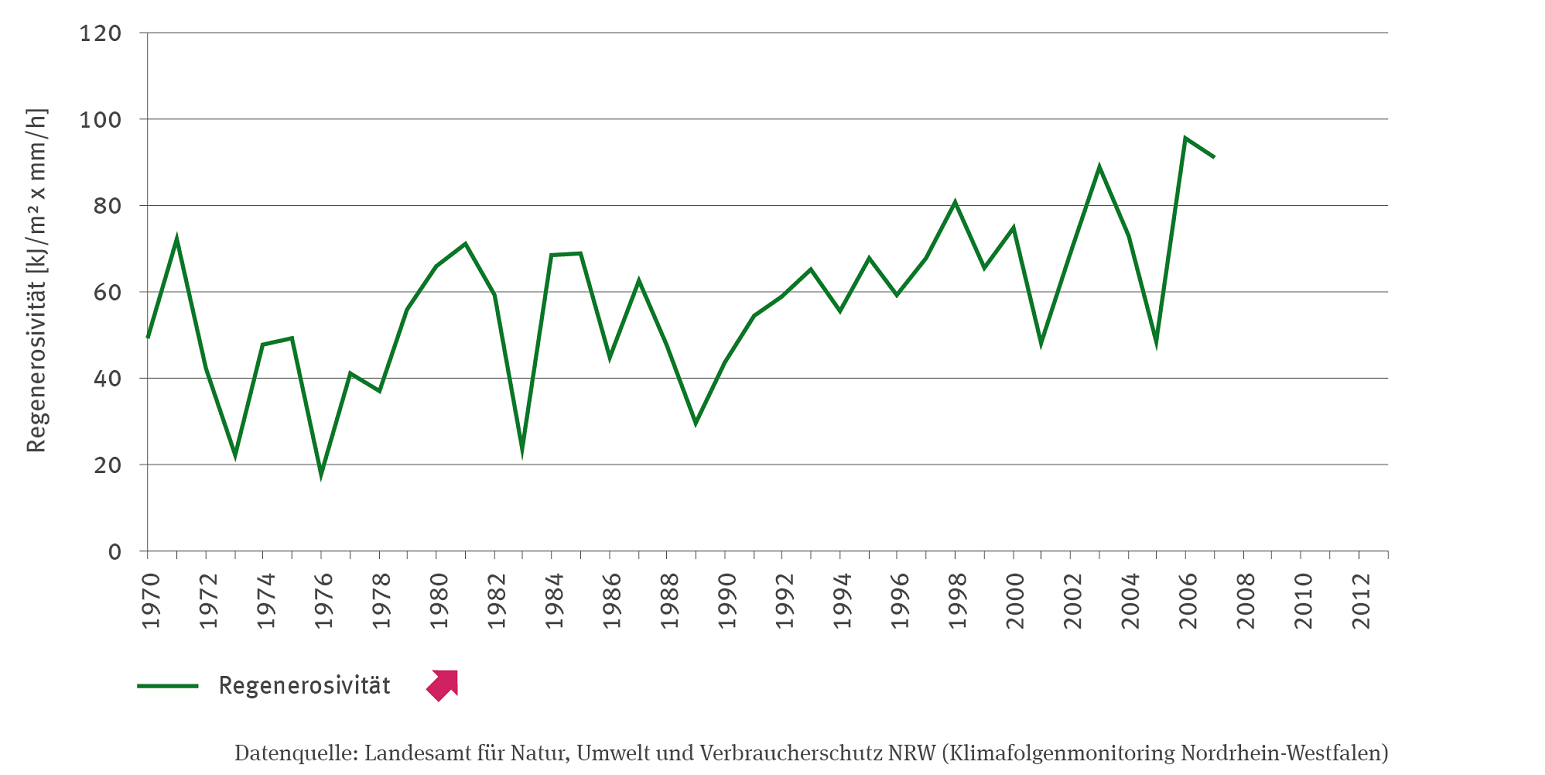 Die Linien-Grafik zeigt die Regenerosivität in Kilojoule pro Quadratmeter mal Millimeter pro Stunde. Abgebildet wird der Zeitraum von 1970 bis 2007. Die Werte schwanken stark zwischen den Jahren und bewegen sich zwischen unter 20 im Jahr 1976 und über 90 in 2006. Die Zeitreihe hat einen signifikant steigenden Trend.