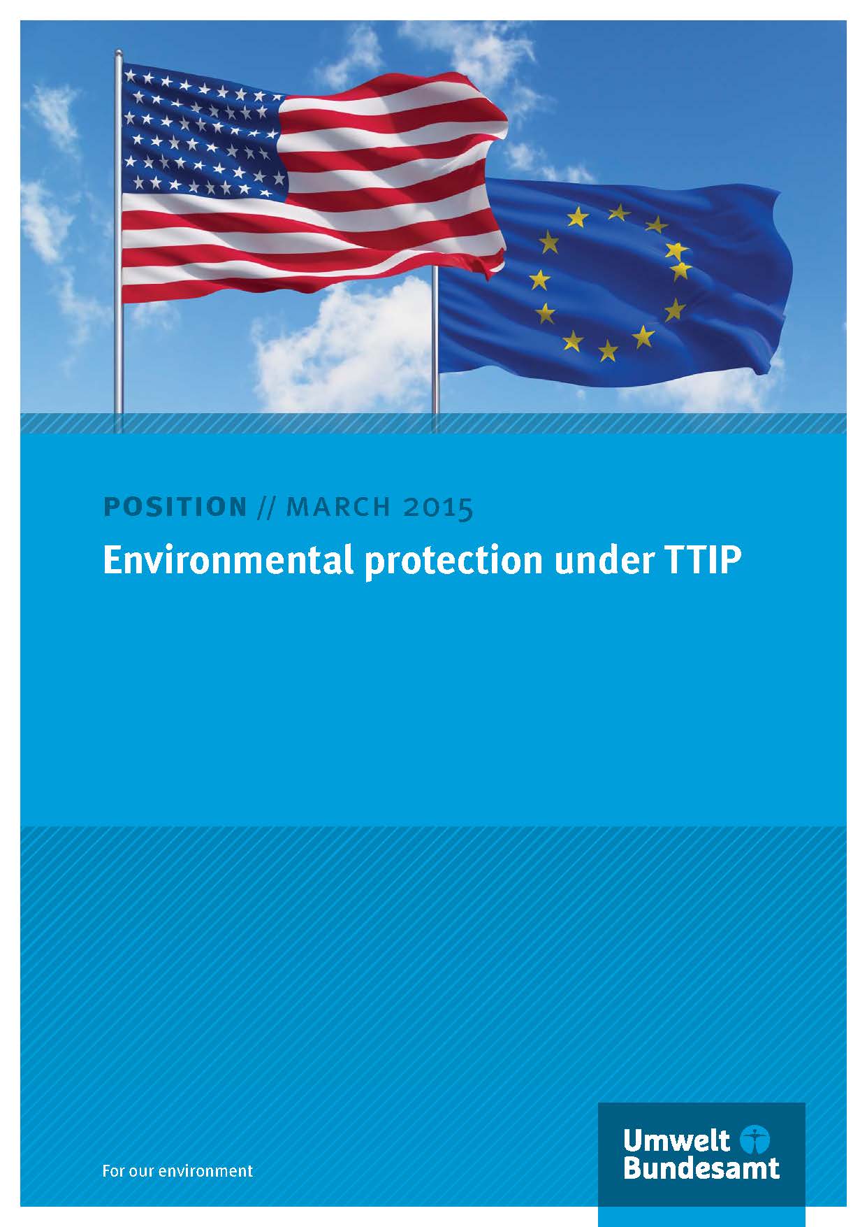 Cover of the position paper "Environmental protection under TTIP" with a photo of a flag of the USA and a flag of the European Union