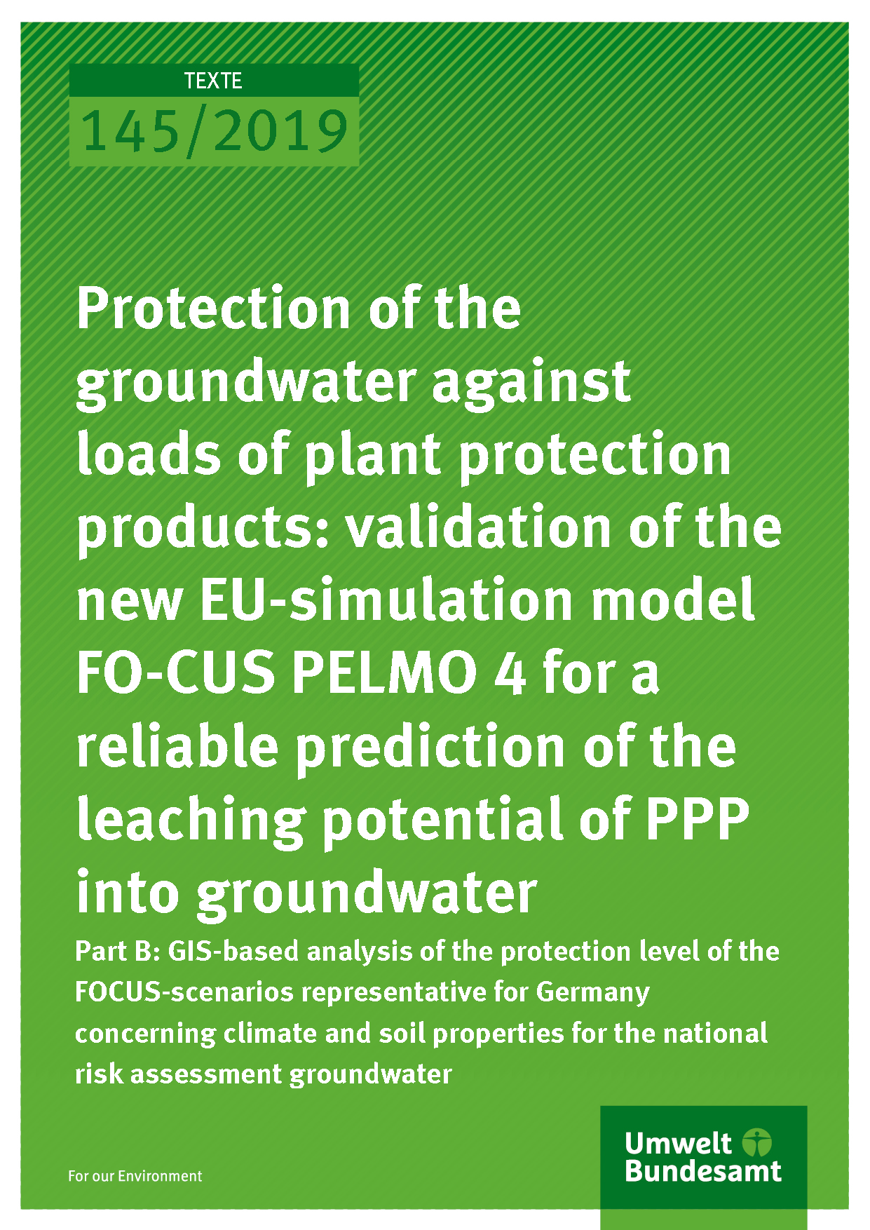 Cover of publication TEXTE 145/2019 Protection of the groundwater against loads of plant protection products: validation of the new EU-simulation model FOCUS PELMO 4 for a reliable prediction of the leaching potential of PPP into groundwater