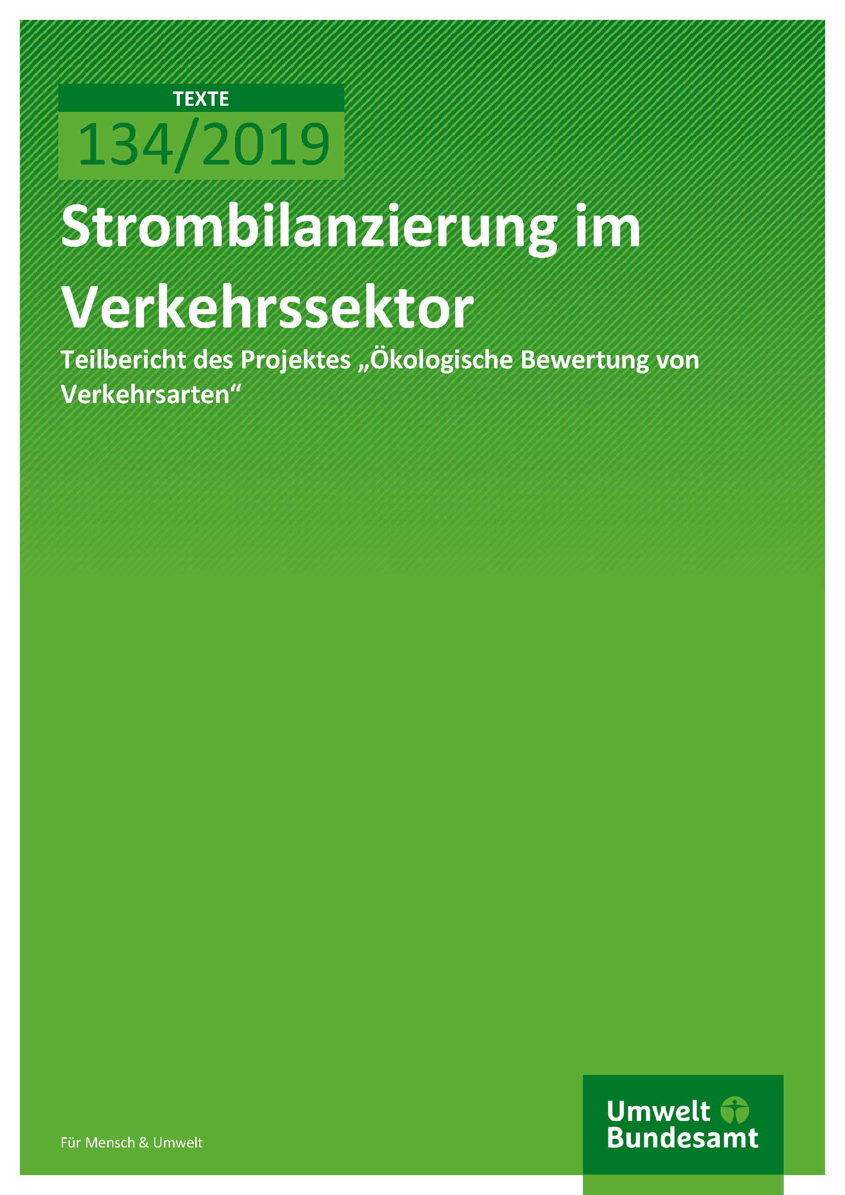 Cover der Publikation TEXTE 134/2019 Strombilanzierung im Verkehrssektor Teilbericht des Projektes „Ökologische Bewertung von Verkehrsarten“ von Joß Bracker, Dominik Seebach Öko-Institut e.V., Freiburg Mit Beiträgen von Martin Pehnt ifeu – Institut für Energie- und Umweltforschung Heidelberg GmbH, Heidelberg Im Auftrag