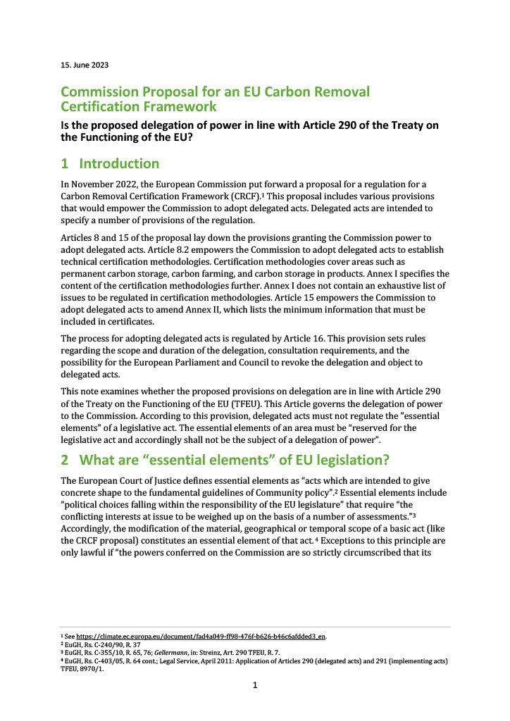 Commission Proposal for an EU Carbon Removal Certification Framework - Is the proposed delegation of power in line with Article 290 of the Treaty on the Functioning of the EU?