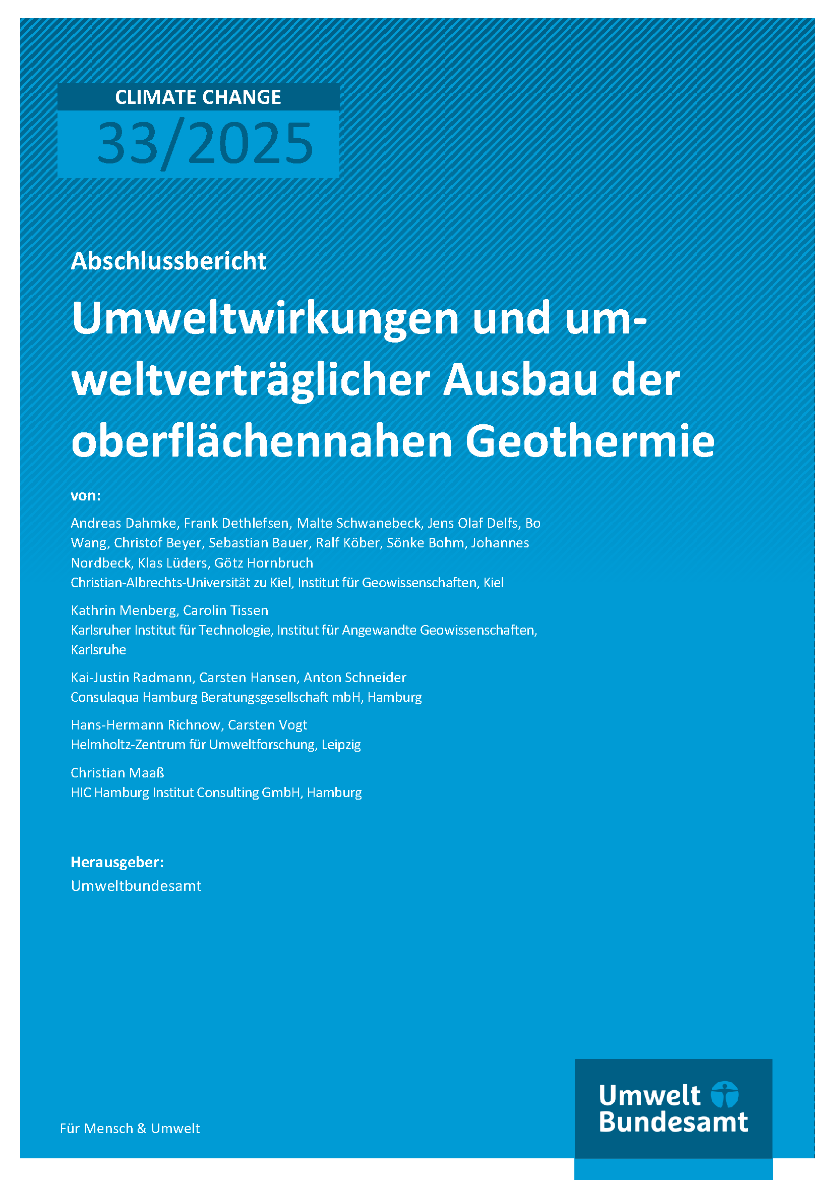 Cover des Berichts "Umweltwirkungen und umweltverträglicher Ausbau der oberflächennahen Geothermie"