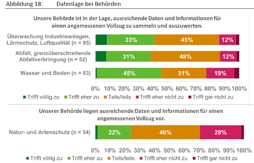 Das Balkendiagramm zeigt, wie die Befragten aus den Bereichen Immissionsschutz, Abfall und Gewässerschutz die folgende Aussage einschätzen: "Unsere Behörde ist in der Lage, ausreichende Daten und Informationen für einen angemessenen Vollzug zu sammeln und auszuwerten.". Für die Befragten aus Naturschutz zeigt es die Einschätzungen zu folgender Aussage: "Unserer Behörde liegen ausreichende Daten und Informationen für einen angemessenen Vollzug vor.". Die Antwortmöglichkeiten reichten von "trifft völlig zu" über "trifft eher zu" und "teils/teils" bis zu "trifft eher nicht zu" und "trifft gar nicht zu".