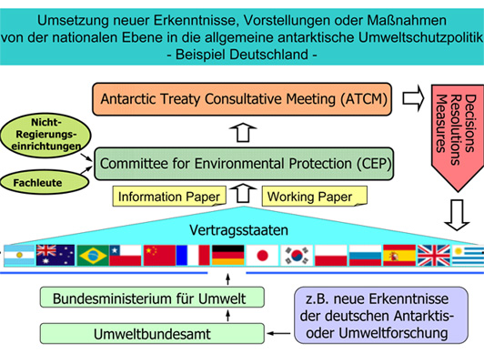 Umsetzung neuer Erkenntnisse, Vorstellungen oder Maßnahmen von der nationalen Ebene in die allgemeine antarktische Umweltschutzpolitik