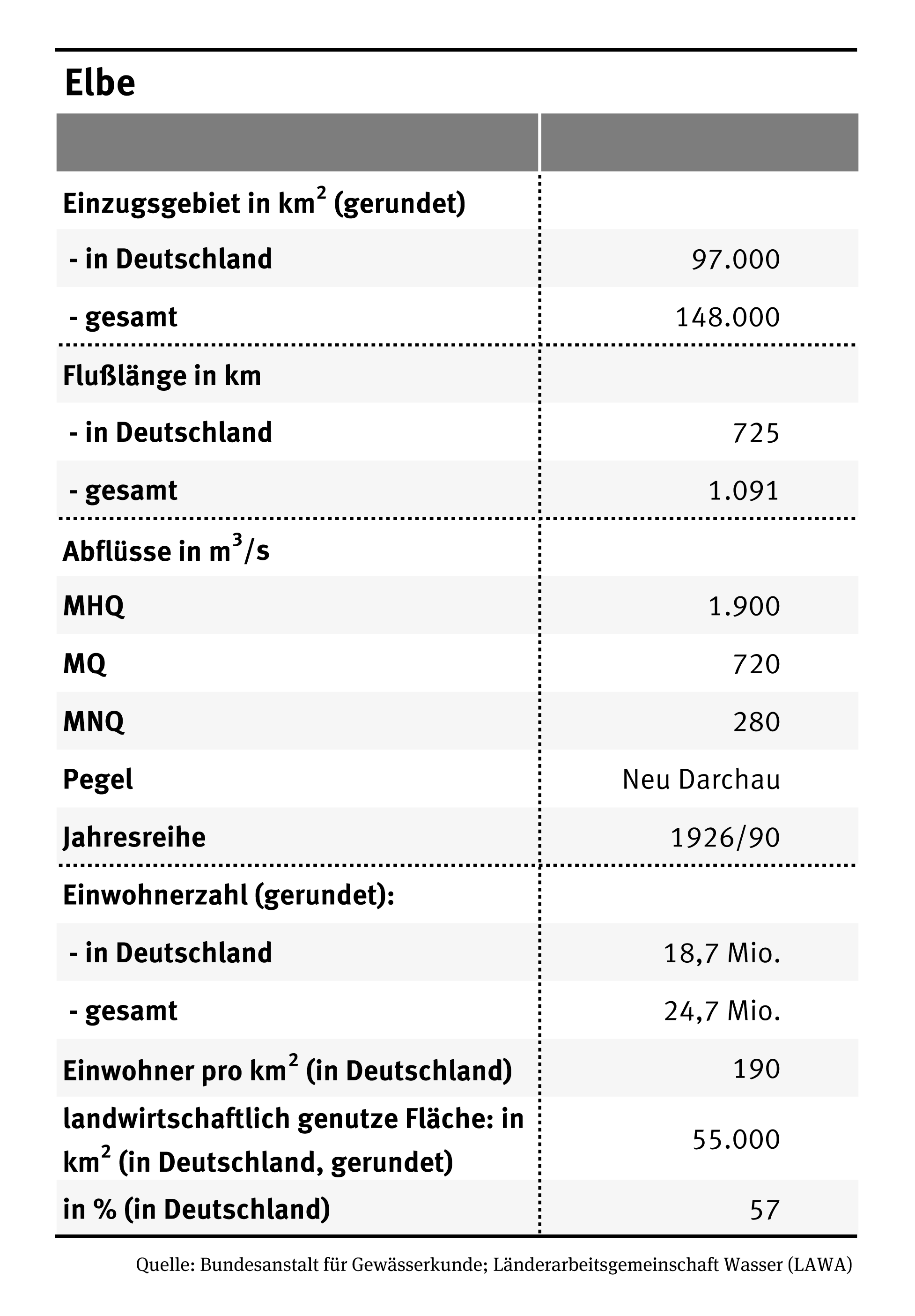 Die Tabelle zeigt die wichtigsten Eckdaten zur Elbe wie Einzugsgebiet, Flußlänge, Abflüsse, Einwohnerzahl. Die Gesamtlänge der Elbe beträgt 1091 Kilometer und hat ein Einzugsgebiet von 148.00 Quadratkilometern.
