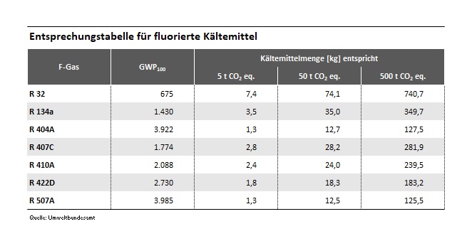 Entsprechungstabelle für fluorierte Kältemittel