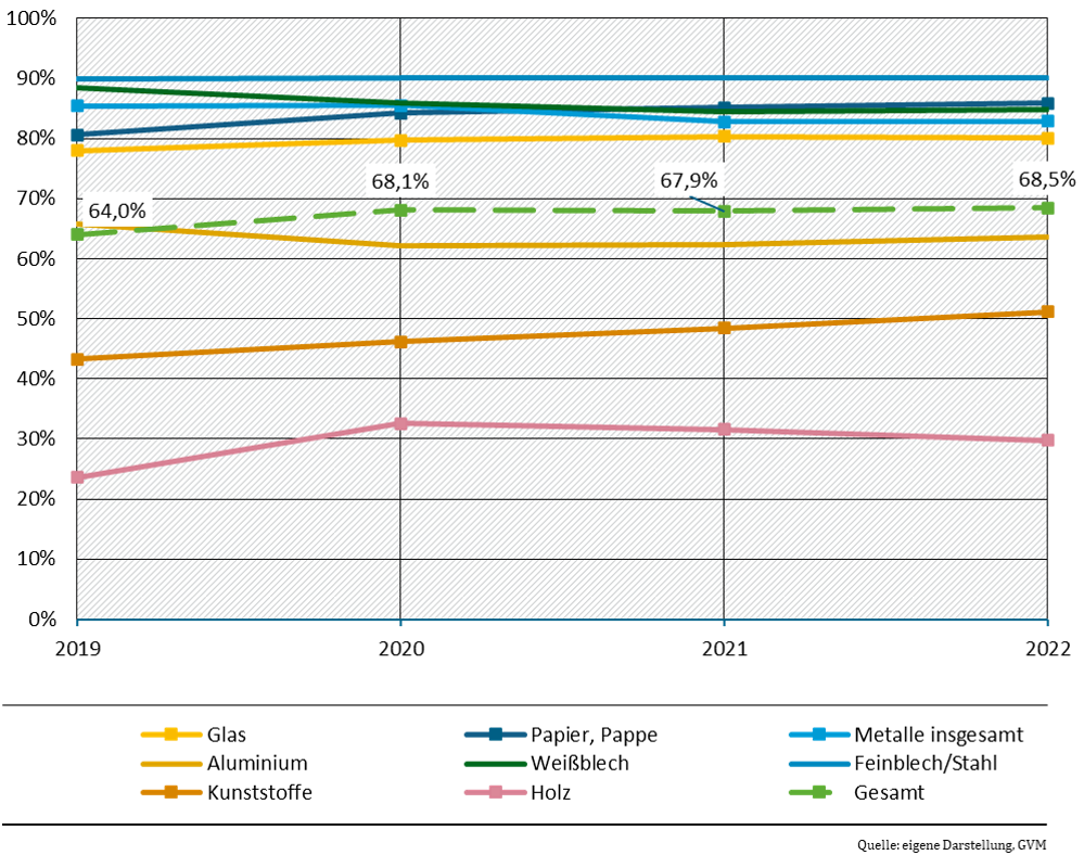 Entwicklung der Recyclingquoten nach Verpackungsabfallmaterialien 2019 - 2022