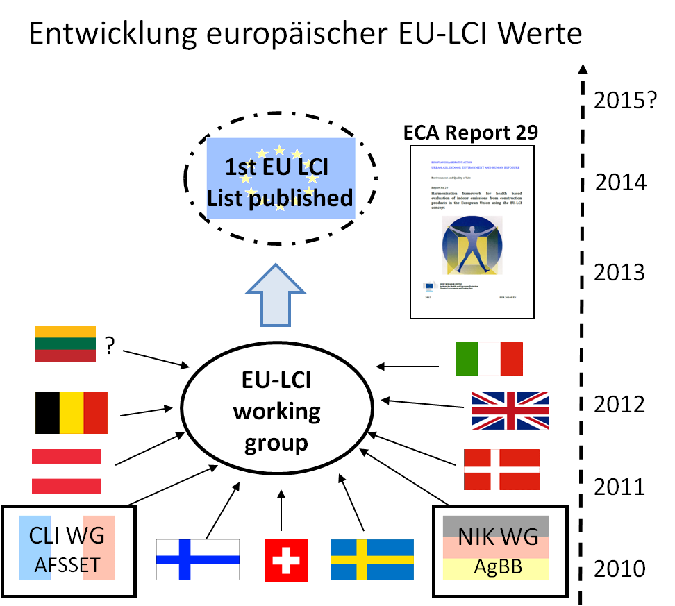 Flaggen und Arbeitsgruppen europäischer Länder sind durch Pfeile mittig mit der gemeinsamen Arbeitsgruppe EU-LCI verbunden. Ein breiter Pfeil weist von diesem Arbeitsgruppensymbol nach oben auf das in 2014 gewünschte Ziel einer EU-LCI-Liste.