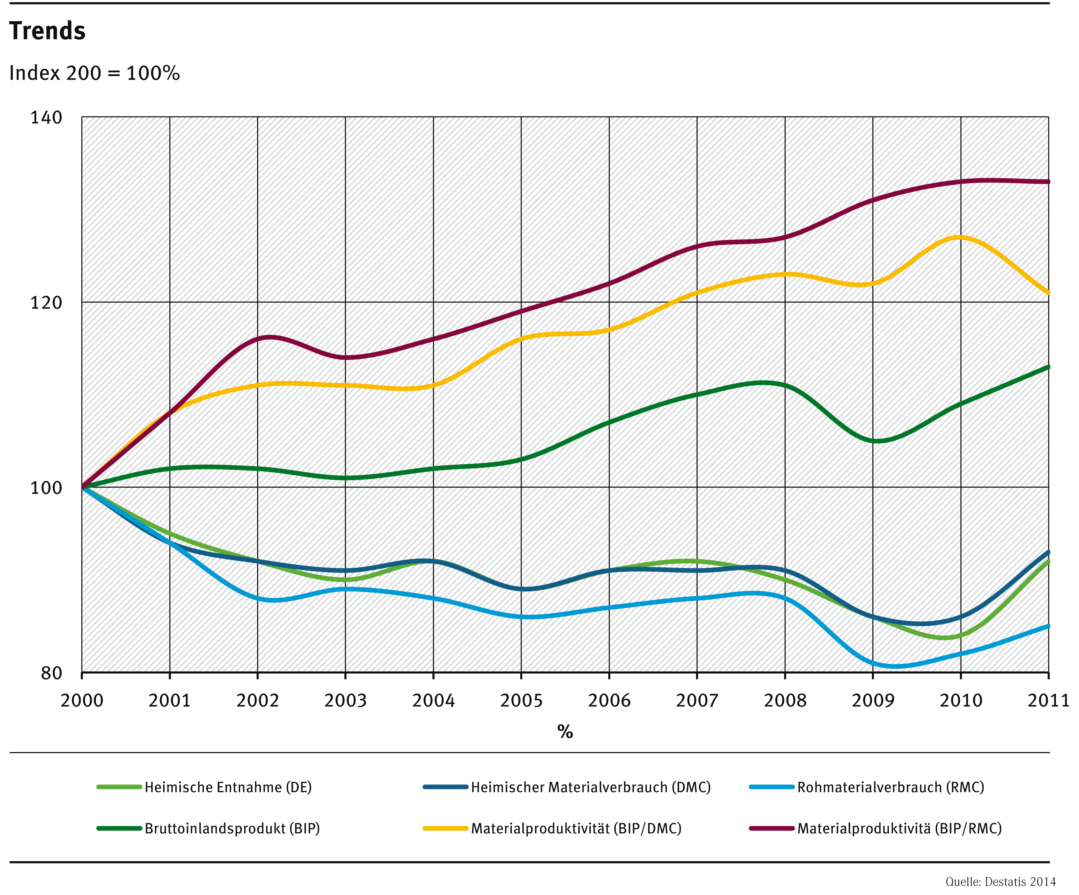 Entwicklung Materialverbrauch, Bruttoinlandsprodukt, Materialproduktivität in Deutschland, 2000-2011