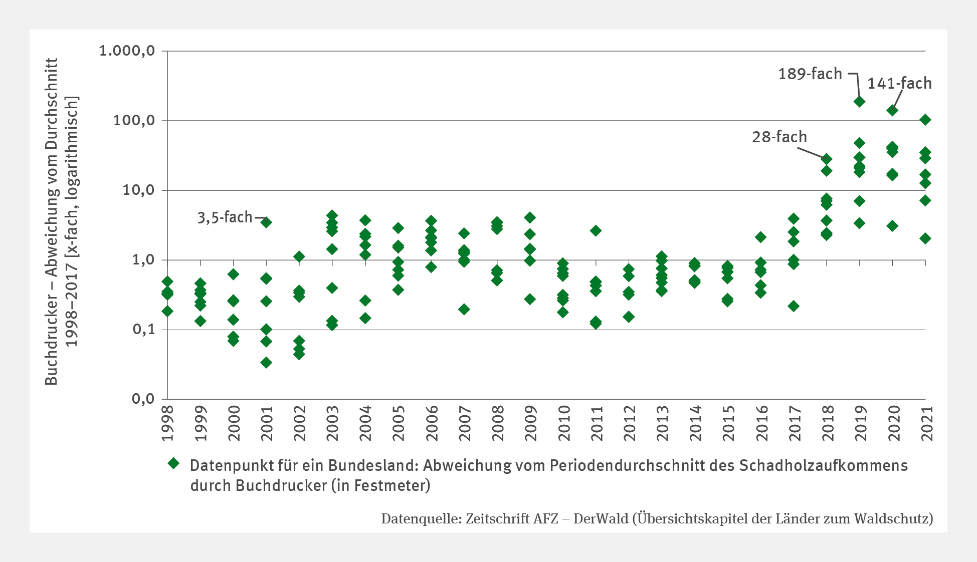 Das Punktdiagramm FW-I-7 "Schadholzaufkommen durch Buchdrucker - Fallstudie" zeigt für den Zeitraum von 1998 bis 2021 die Abweichung des jährlichen Schadholzaufkommens durch den Buchdrucker als Vielfaches des langjährigen Periodendurchschnitts des Zeitraums 1998 - 2017. In jedem Jahr repräsentierten acht Einzelpunkte die Befallsdaten von acht Bundesländern auf einer logarithmischen Skala. Ab 2018 waren die Schadholzmengen durch Buchdrucker deutlich erhöht, im Jahr 2019 189 Mal so hoch wie im langjährigen Durchschnitt.