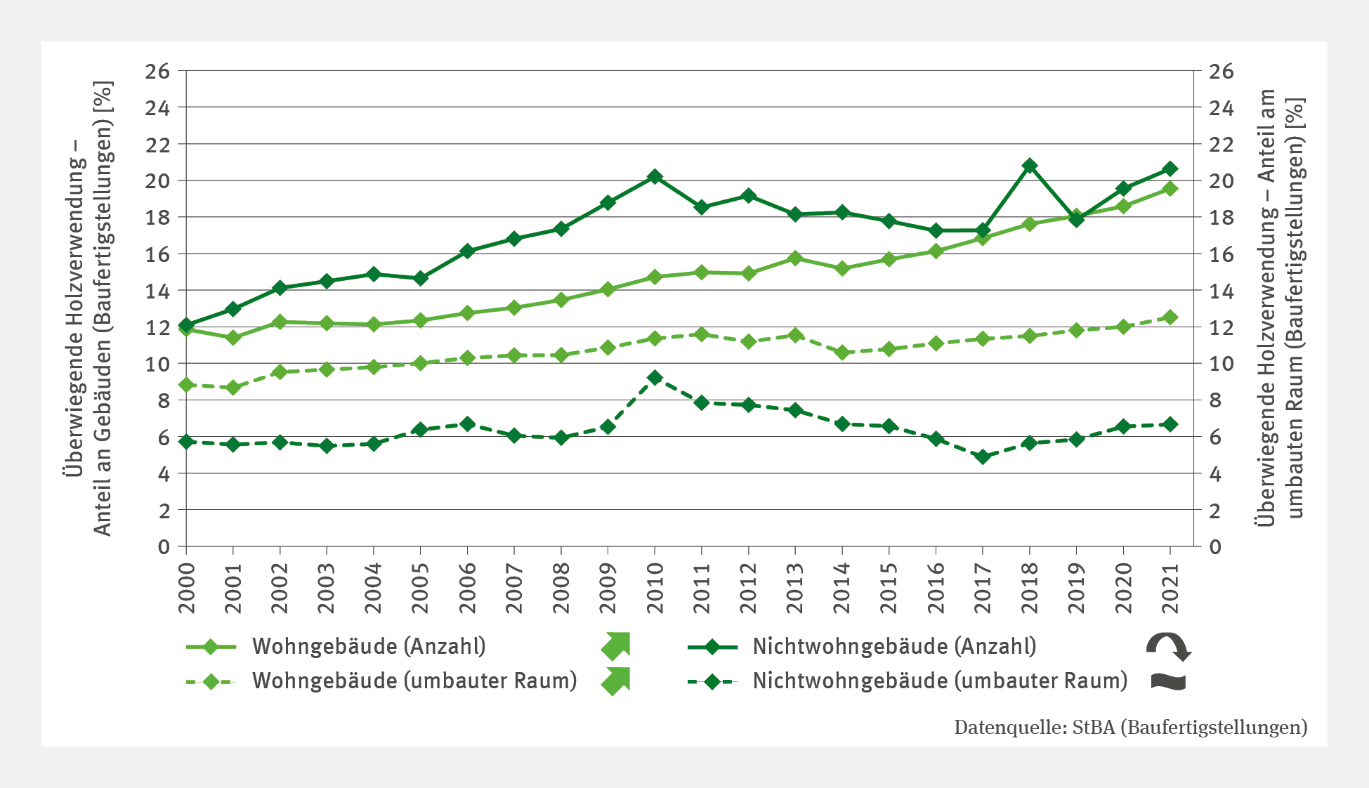 Das Liniendiagramm FW-R-5 "Holzbauquote" zeigt für den Zeitraum von 200 bis 2021 den prozentualen Anteil der überwiegenden Holzverwendung differenziert nach Wohngebäuden und Nichtwohngebäuden sowie nach Gebäudeanzahl und umbautem Raum. Bei den Wohngebäuden ist die Holzverwendung sowohl bezogen auf die Anzahl der Gebäude als auch auf den umbauten Raum signifikant gestiegen. Sie betrug im Jahr 2021 knapp 20 % beziehungsweise etwas über 12 %. Bei den Nichtwohngebäuden betrug der Anteil der überwiegenden Holzverwendung bezogen auf die Anzahl von Gebäuden über 20 %, ist aber in den letzten Jahren signifikant gesunken. Bezogen auf den umbauten Raum lag bei den Nichtwohngebäuden kein signifikanter Trend vor. Der Anteil schwankt um die 6 %.