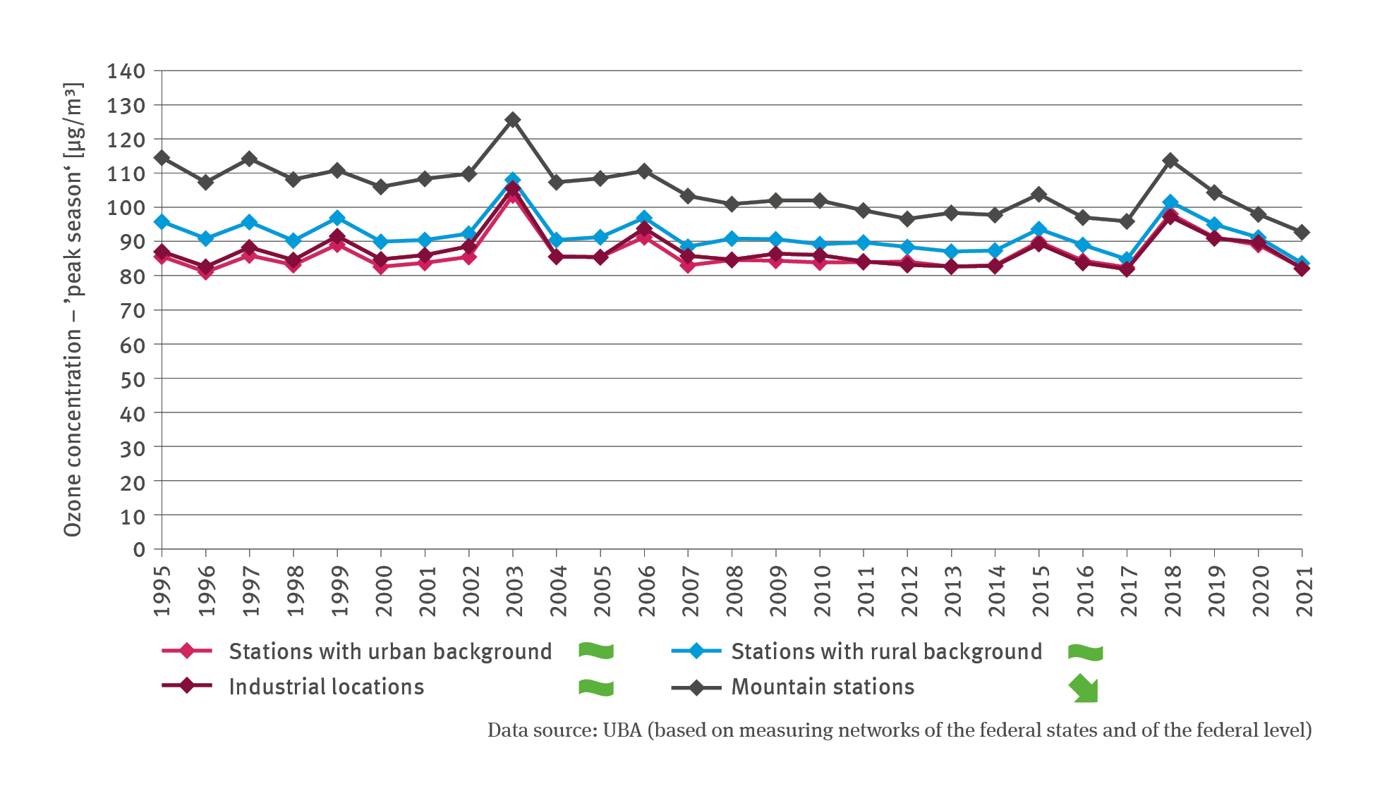 The line chart GE-I-9 ’Ozone burden’ shows the ozone concentration during the ’peak season’ in microgram (µg) per cubic metre from 1995 to 2021 annually. A differentiation is made between stations with an urban background, stations with a rural background, stations in industrial locations and stations in the mountains. For the stations in the mountains, a statistically significant regressive trend has been identified: The ozone concentration dropped from roughly 115 µg/m³ in 1995 to a little above 90 µg/m³ in 2021. This means that the ozone concentration is still higher than in the three other regions. At stations with an urban or a rural background, and in the industrial locations, the ozone concentration was at a similar level, latterly amounting to roughly more than 80 µg/m³. In all regions the ozone concentrations have decreased distinctly beginning in the years from 2018 onwards.