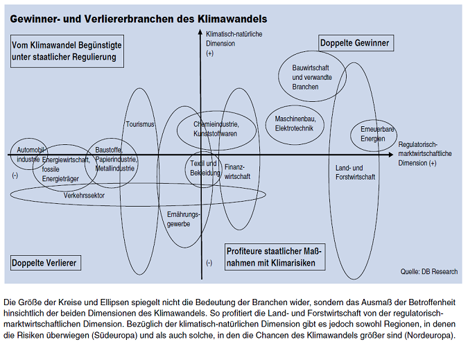 Die Abbildung zeigt, welche Branchen durch den Klimawandel begünstigt oder benachteiligt werden. Dargestellt werden zwei Dimensionen: die klimatisch-natürliche (direkte Risiken und Chancen) sowie die regulatorisch-marktwirtschaftliche (indirekte Risiken und Chancen). Die Größe der Ellipsen spiegelt die Bandbreite der Betroffenheit wider. Die Abbildung ist der Studie "Klimawandel und Branchen" entnommen (DB Research 2007).
