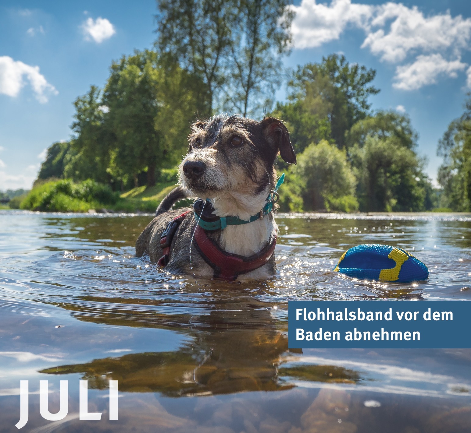 Auch Arzneimittel für unsere Haustiere können ein Problem darstellen, wenn sie direkt in die Umwelt gelangen. Achten Sie deshalb darauf, dass z. B. Hunde einige Tage nach dem Auftragen von Antiparasitika auf die Haut (z. B. im Nacken) nicht baden und nehmen Sie das Flohhalsband vor dem Sprung ins Gewässer ab.