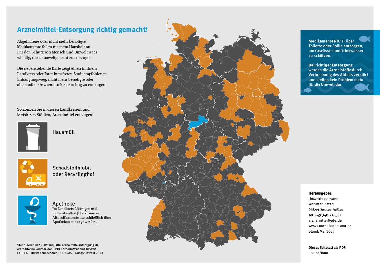 The correct regional disposal routes for used medicines are visualised on a map of German districts and cities.