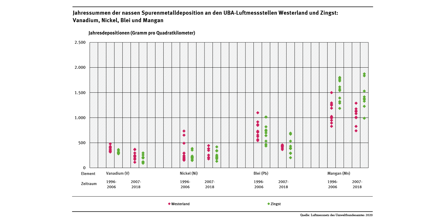 Jahressummen der nassen Spurenmetalldeposition ... Vanadium, Nickel, Blei und Mangan