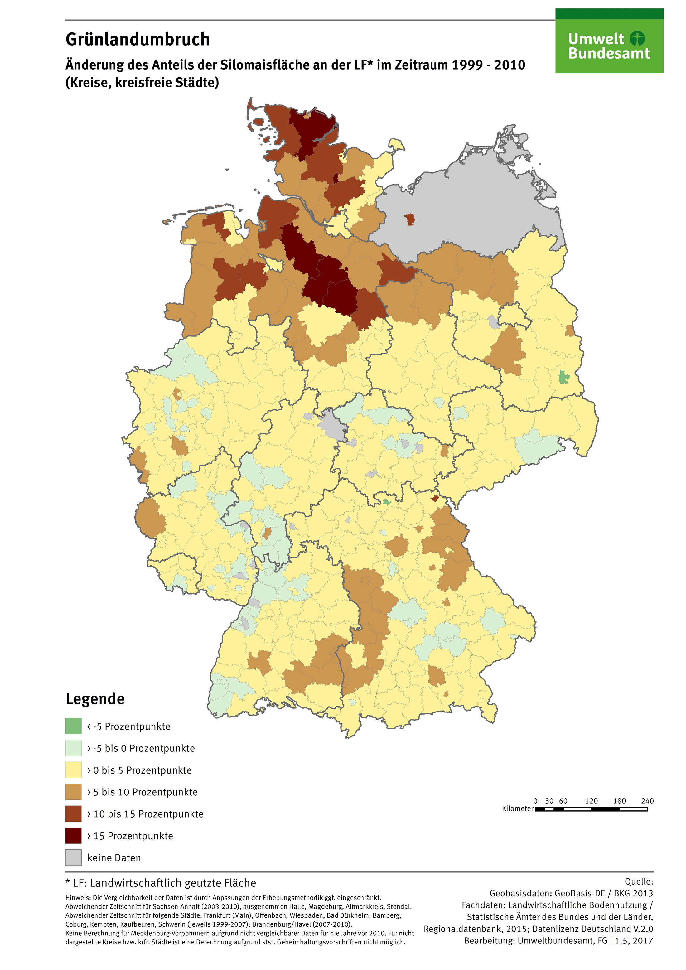 Karte: Grünlandumbruch. Änderung des Anteils der Silomaisfläche an der LF im Zeitraum 1999-2010 ...