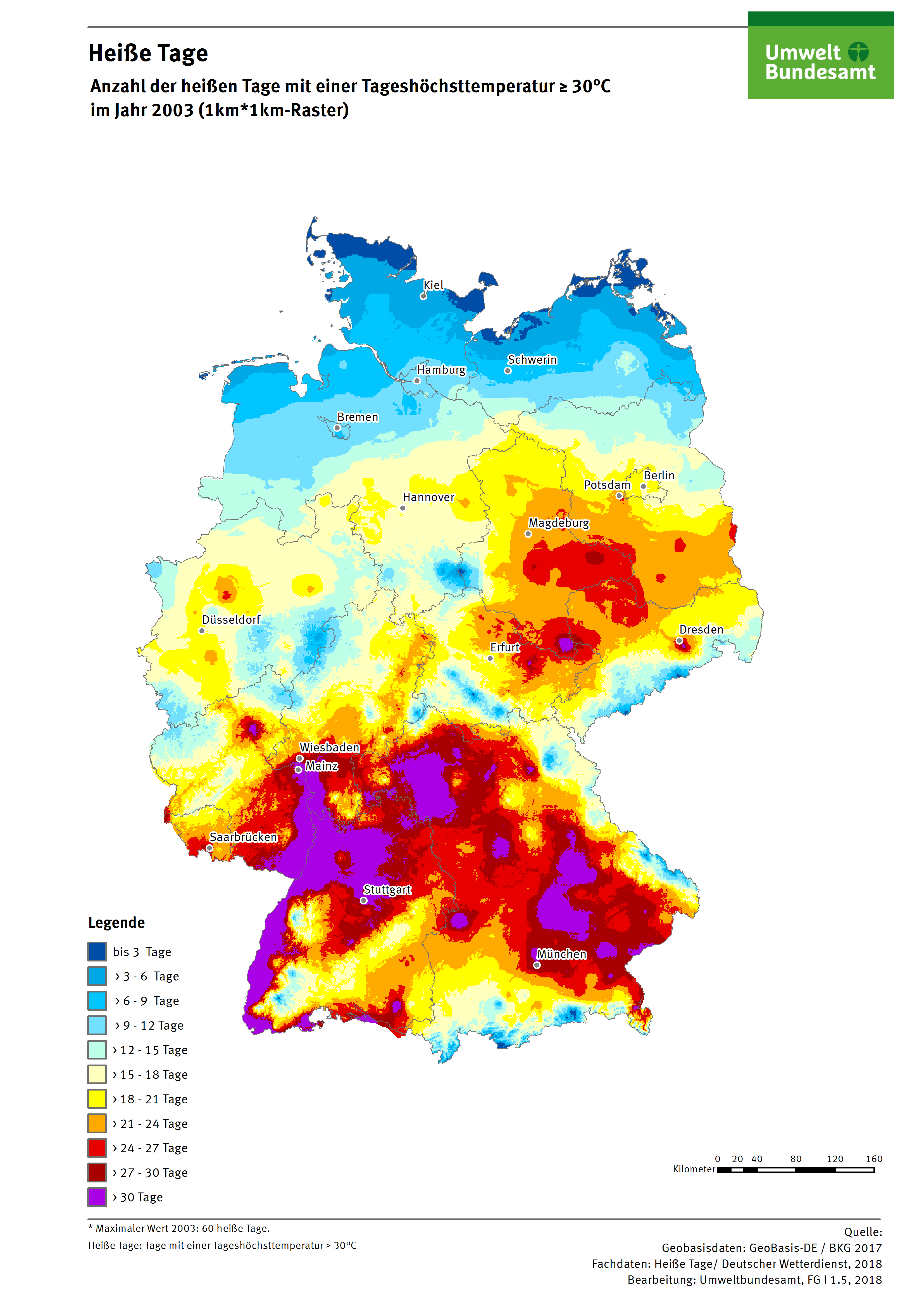 Karte: Heiße Tage - Anzahl der Heißen Tage mit einer Tageshöchsttemperatur >= 30°C im Jahr 2003