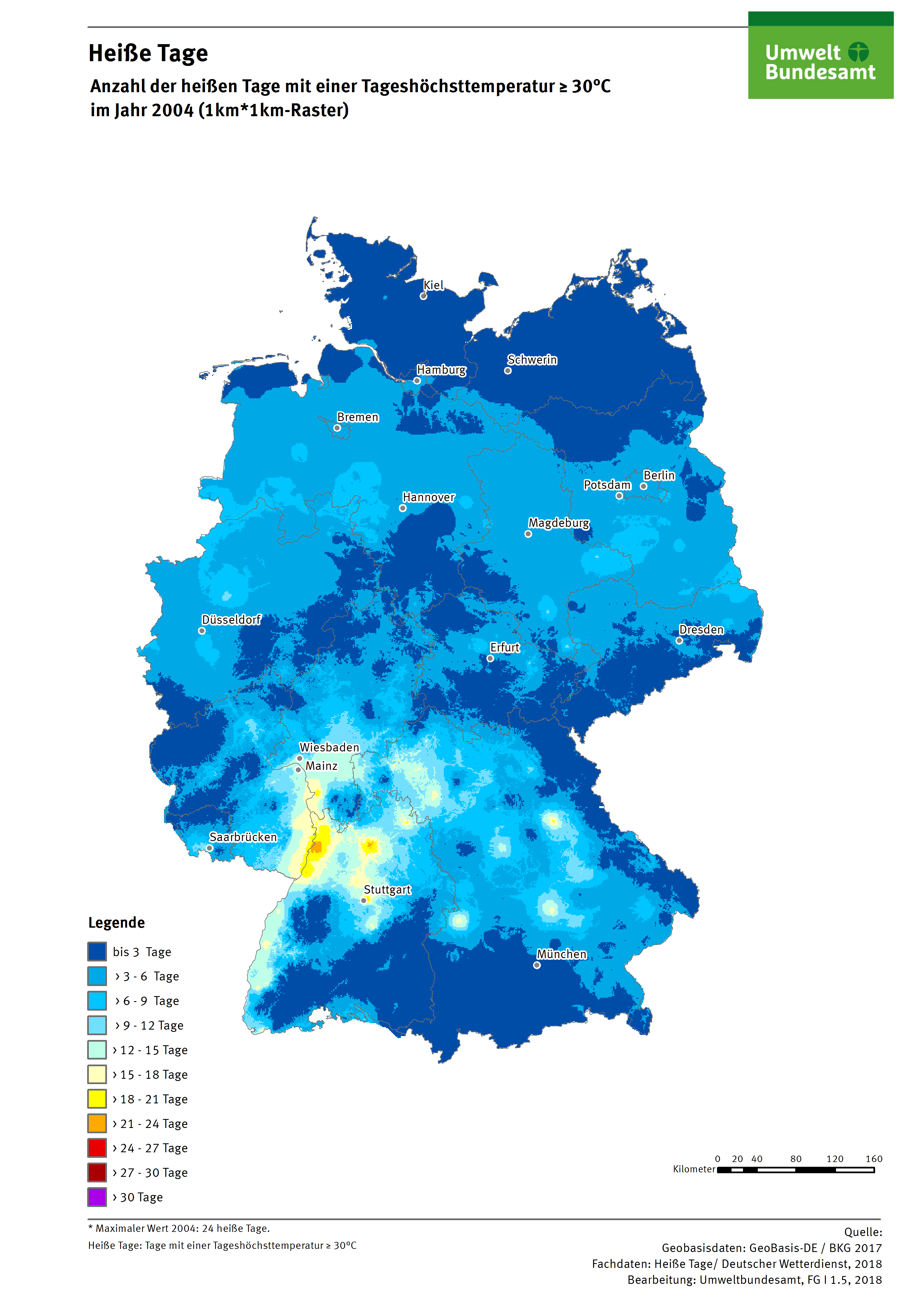 Karte: Heiße Tage - Anzahl der Heißen Tage mit einer Tageshöchsttemperatur >= 30°C im Jahr 2004