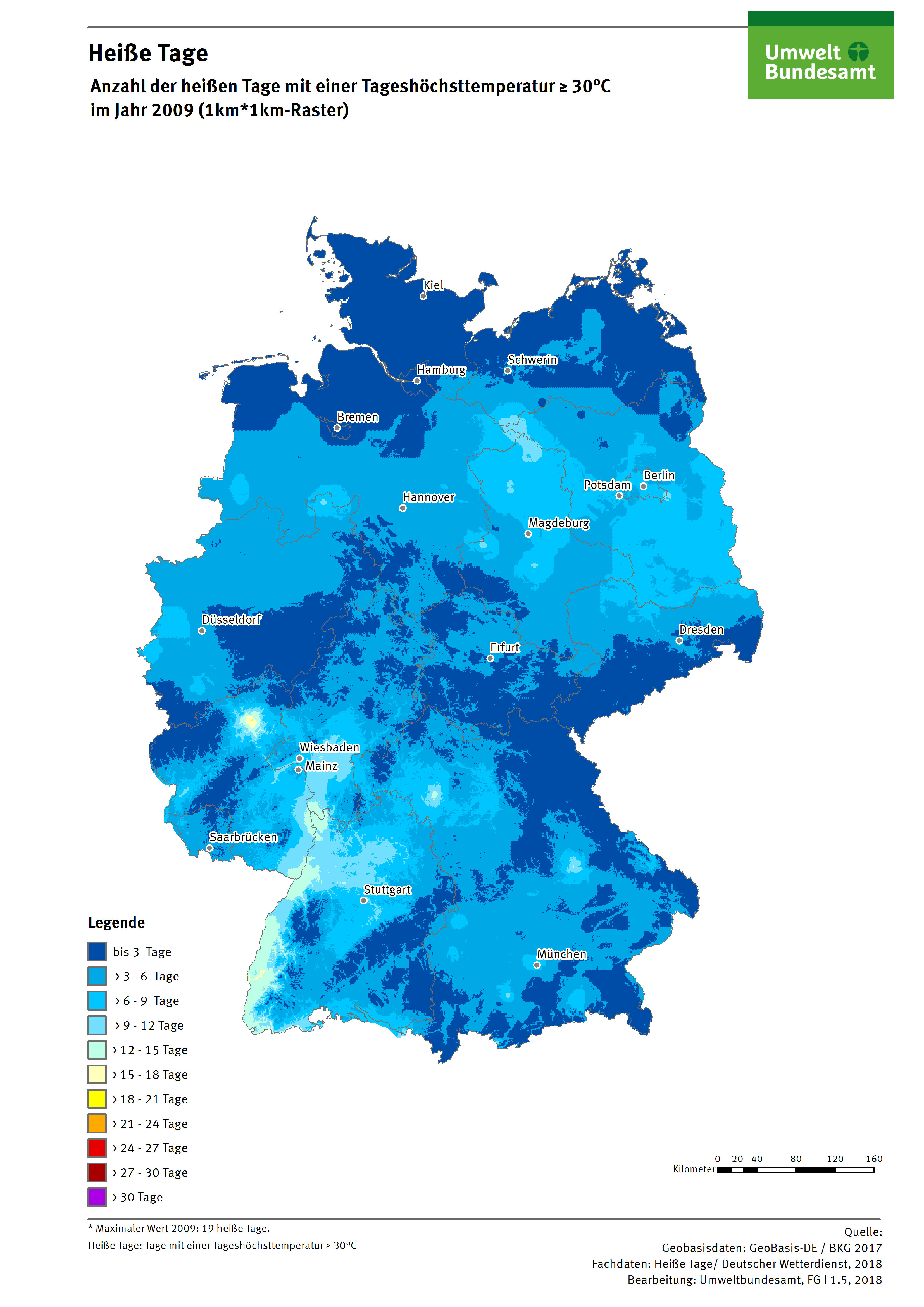 Karte: Heiße Tage - Anzahl der Heißen Tage mit einer Tageshöchsttemperatur >= 30°C im Jahr 2009