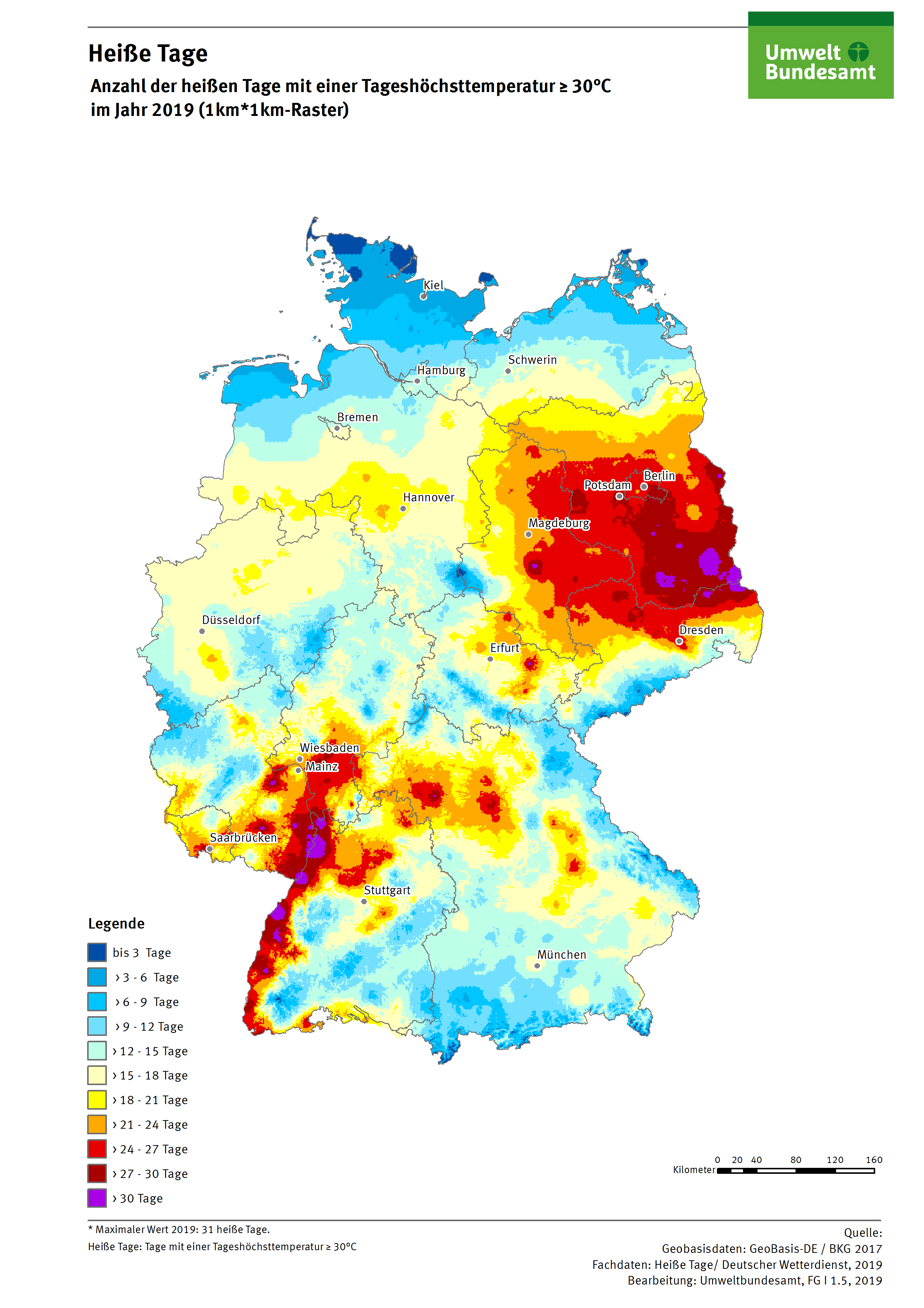 Karte: Heiße Tage - Anzahl der Heißen Tage mit einer Tageshöchsttemperatur >= 30°C im Jahr 2019
