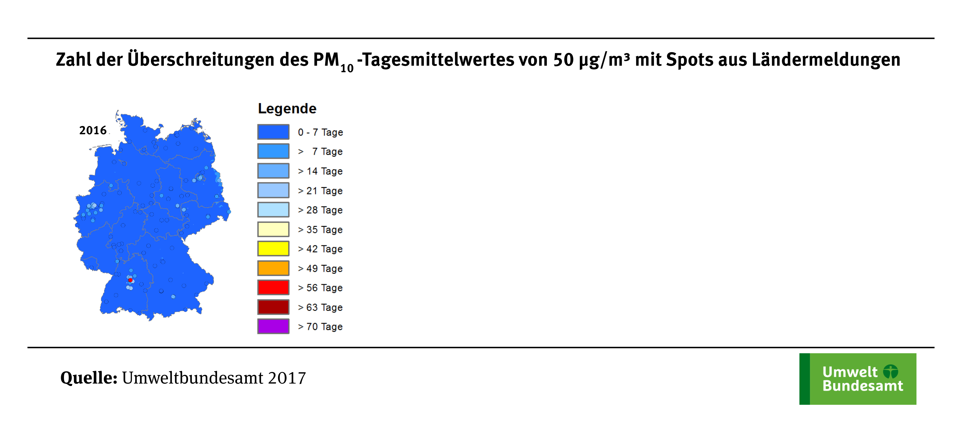 Karte: Zahl der Überschreitungen des PM10-Tagesmittelwertes (2016)