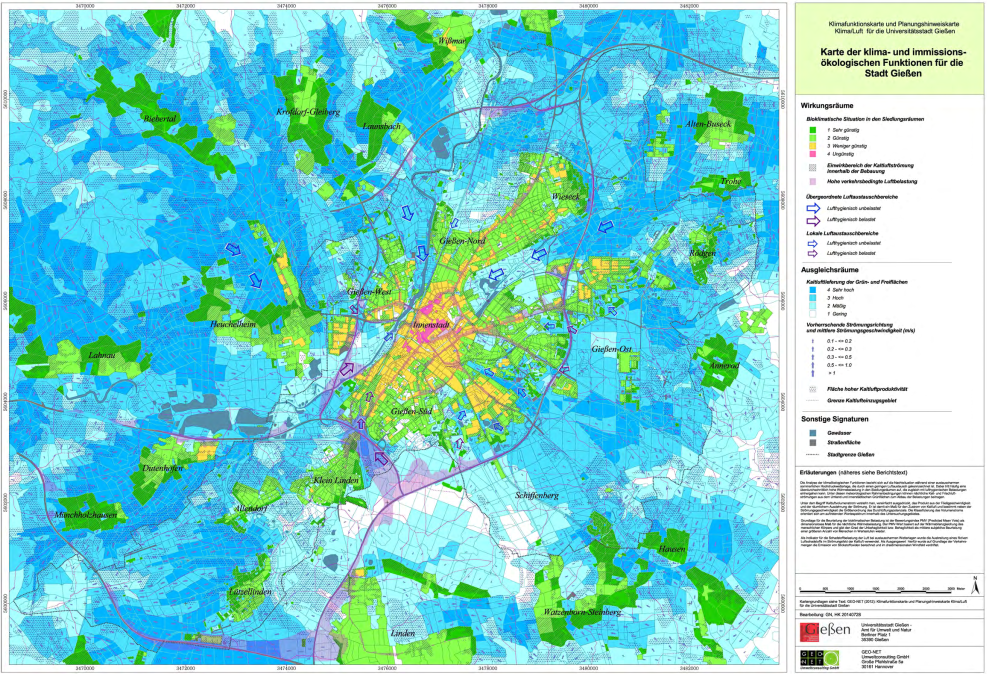 Die Karte der klima- und imissionsökologischen Funktionen für die Stadt Gießen zeigt Wirkungsräume, wie die bioklimatische Situation in Siedlungsräumen und Luftaustauschbereiche, sowie Grün- und Freiflächen als Ausgleichräume auf und dient als Basis für die Planungshinweiskarte der Stadt. Siehe: https://parlamentsinfo.giessen.de/vo0050.php?__kvonr=14589
