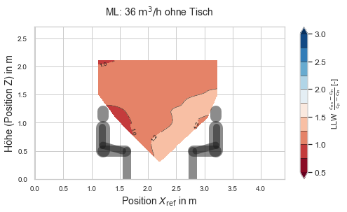 LLW in der vertikalen Schnittebene bei 36 Kubikmetern pro Stunde und Person.ML, ohne Tisch