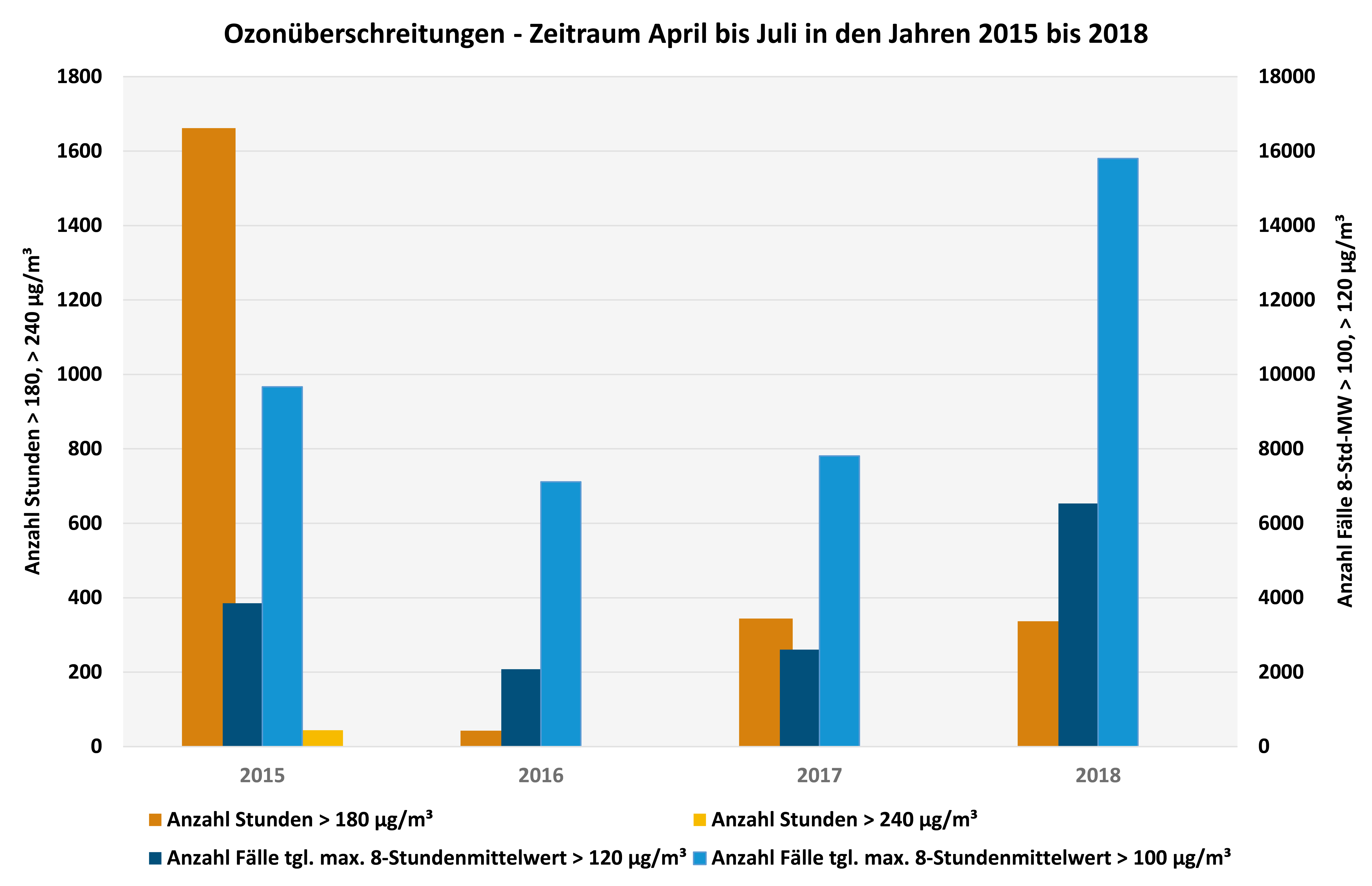 „Anzahl Fälle mit maximalem 8-Stundenmittelwert > 120/100 µg/m³ bedeutet“, wie häufig im Zeitraum vom 1.4.bis jeweils zum 31.7. an Tagen und Stationen maximale Ozonwerte über der jeweiligen Schwelle auftraten. Das heißt, wenn z.B. am 10.4.2015 an 20 Stationen 120 µg/m³ überschritten waren, so wird dies als 20 „Fälle“ gezählt. Alle Fälle werden über den Zeitraum aussummiert. Bei der Anzahl der Stunden werden alle Stunden mit Überschreitungen aufsummiert, z.B. 10 Stunden am 1.7.2015 an Station XY + 6 Stunden an Station AB am 3.6.2015 usw.