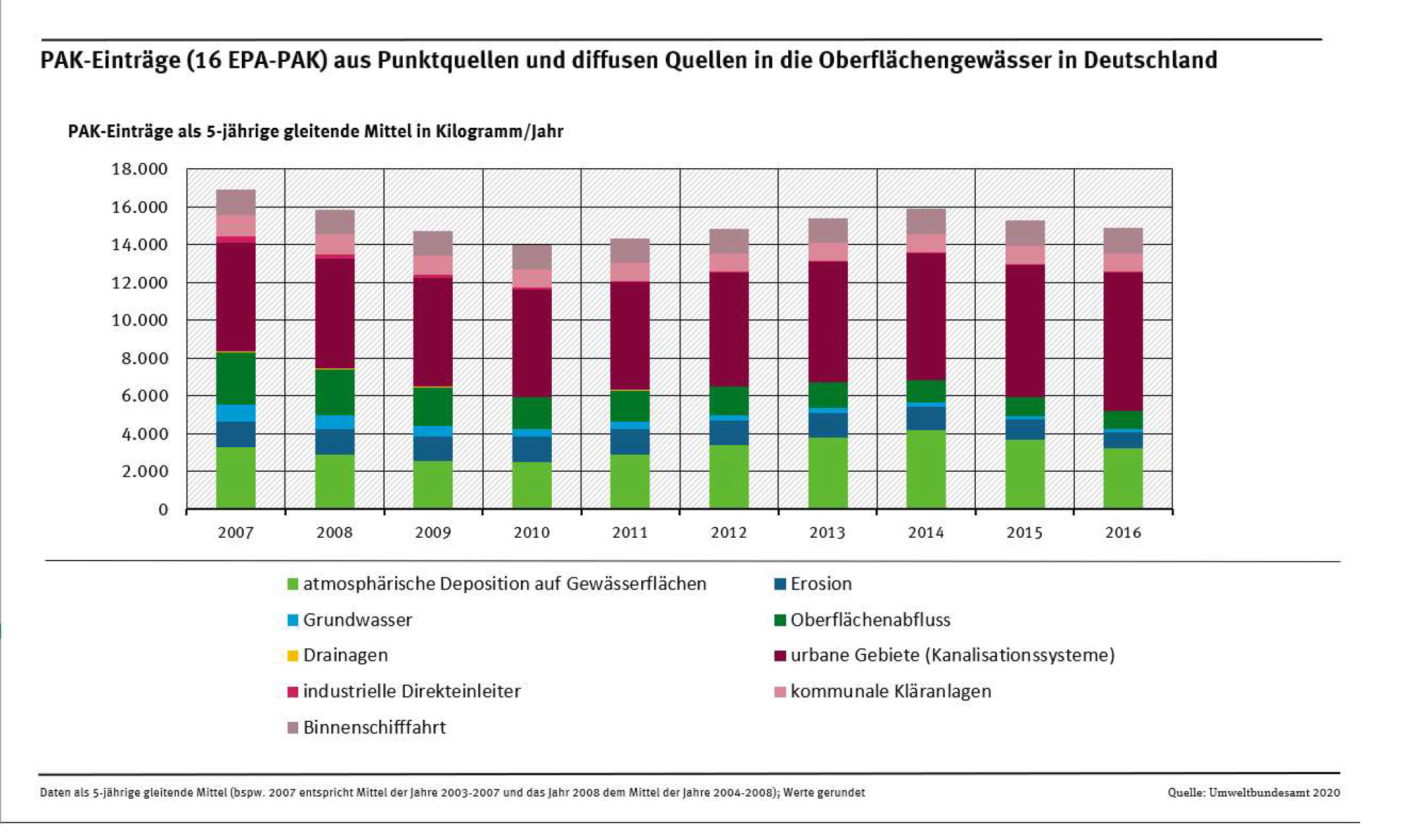 Eintrag Polyzyklischen aromatischen Kohlenwasserstoffe (hier Summe der 16 PAK der US-Environmental Protection Agency (EPA)) in die Gewässer in Deutschland (2003 bis 2016) über unterschiedliche Eintragspfade; dargestellt als 5-jährige gleitende Mittelwerte
