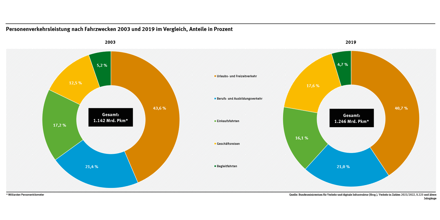 Personenverkehrsleistung nach Fahrzwecken 2003 und 2019 im Vergleich, Anteile in Prozent