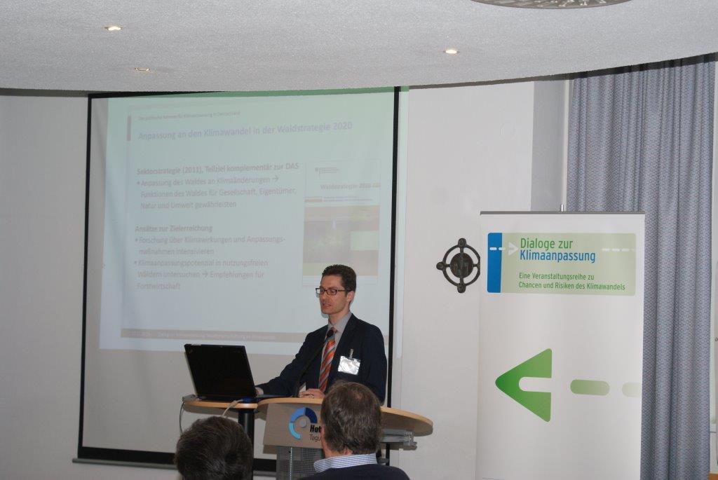 Vortragender steht am Rednerpult. Ein aufgeklapptes Notebook liegt auf dem Rednerpult. Im Hintergrund wird die Präsentation gezeigt: Anpassung an den Klimawandel in der Waldstrategie 2020.