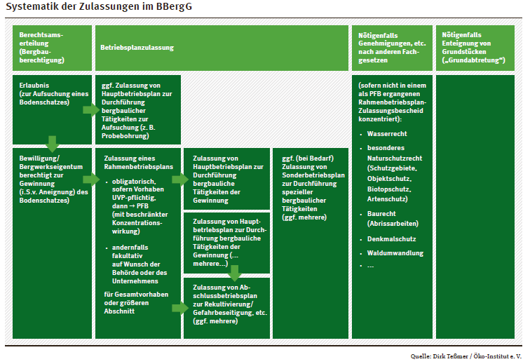 Die Abbildung zeigt den gestuften bergrechtlichen Verfahrensablauf von der Rechteübertragung am bergfreien Bodenschatz, über die Genehmigung und Durchführung des Abbaubetriebes bis zu seiner Beendigung.