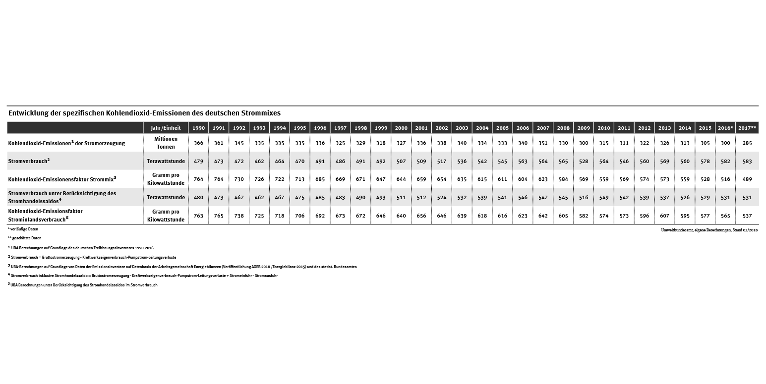 Tab: Entwicklung der spezifischen Kohlendioxid-Emissionen des deutschen Strommixes