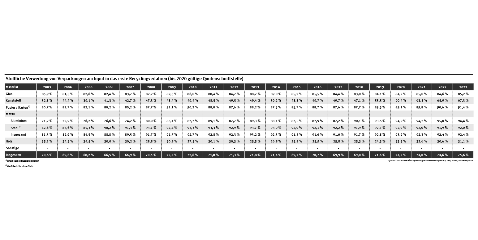 Tab: Stoffliche Verwertung von Verpackungen am Input in das erste Recyclingverfahren