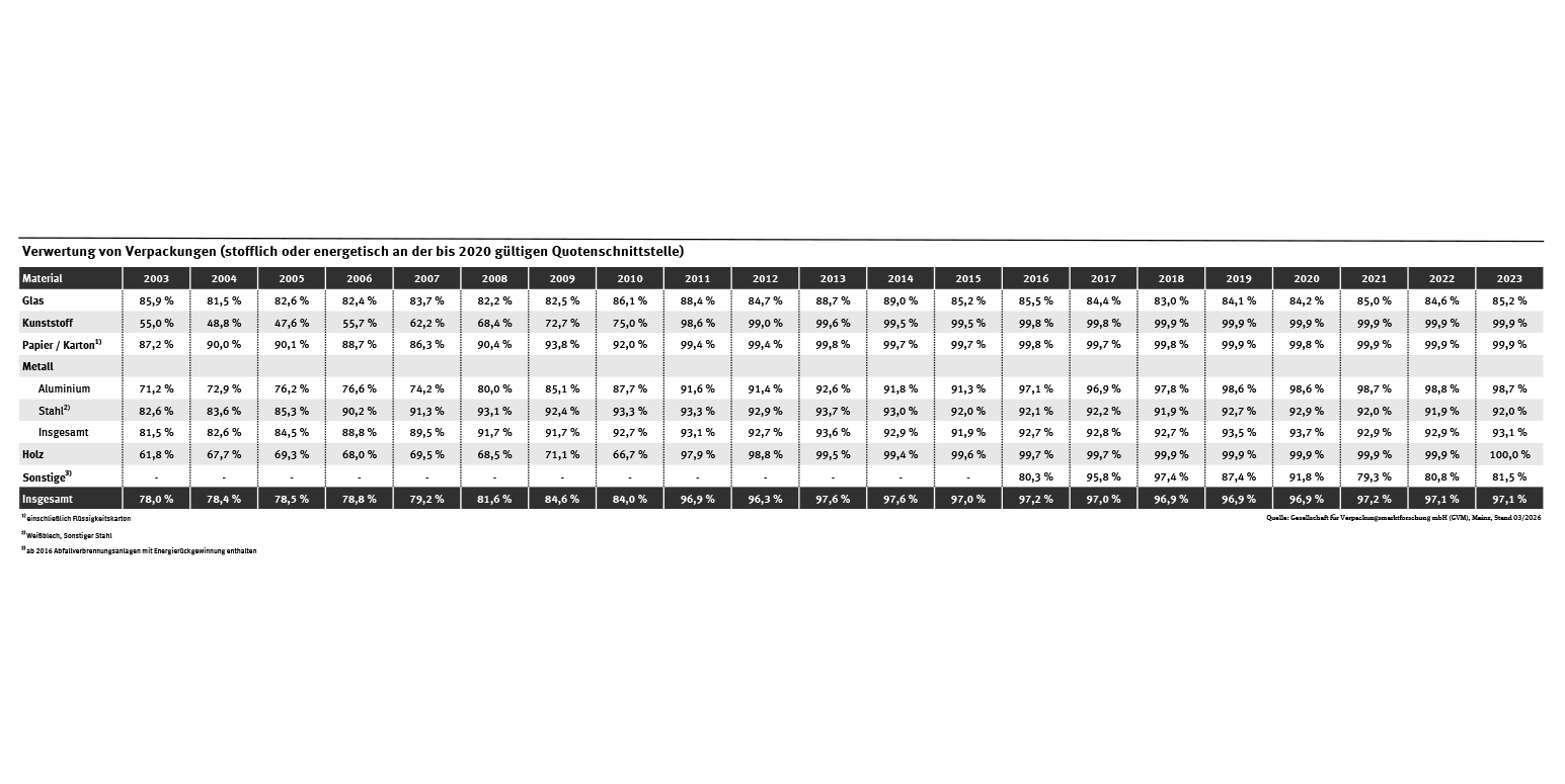 Tab: Verwertung von Verpackungen (stofflich oder energetisch an der bis 2020 ...