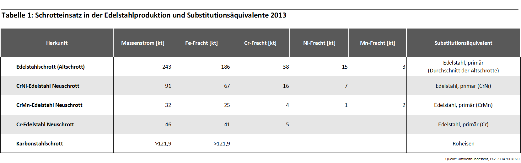 Tabelle 1: Schrotteinsatz in der Edelstahlproduktion und Substitutionsäquivalente 2013